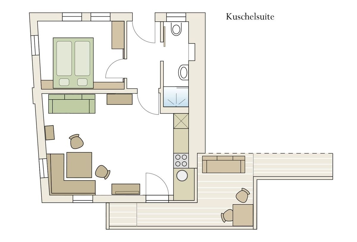 Die gemütliche Ferienwohnung »Kuschelsuite« liegt im Seitentrakt des Bauernhauses und verfügt über eine eigene Sonnenterrasse, von der Sie einen wunderschönen Panoramablick genießen können. Sie bietet mit 35 m² Platz für 2 Personen und ist stilvoll eingerichtet – mit Wohnküche, Sitzecke, gemütlicher Wohnlandschaft (Eckcouch) und Badezimmer.