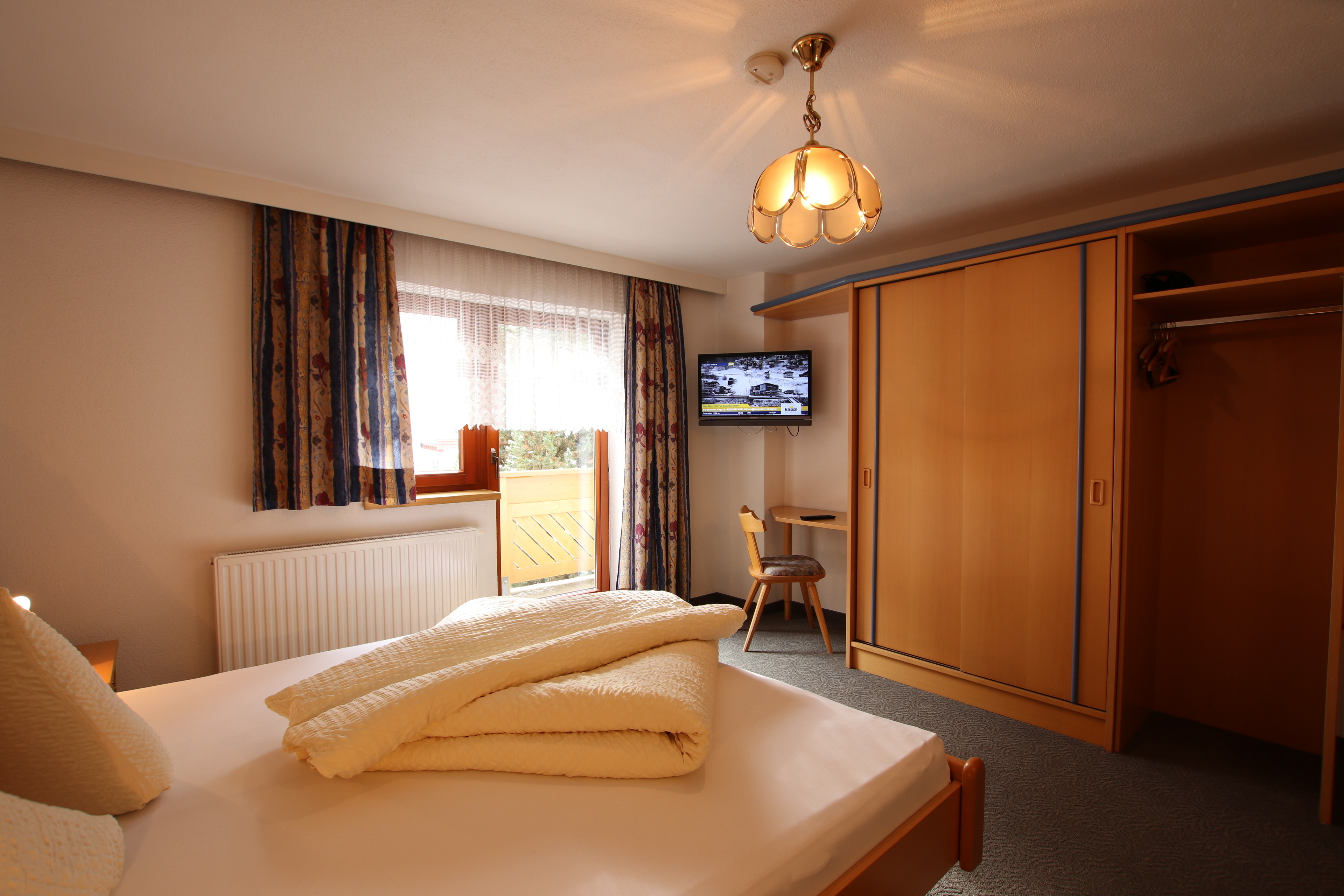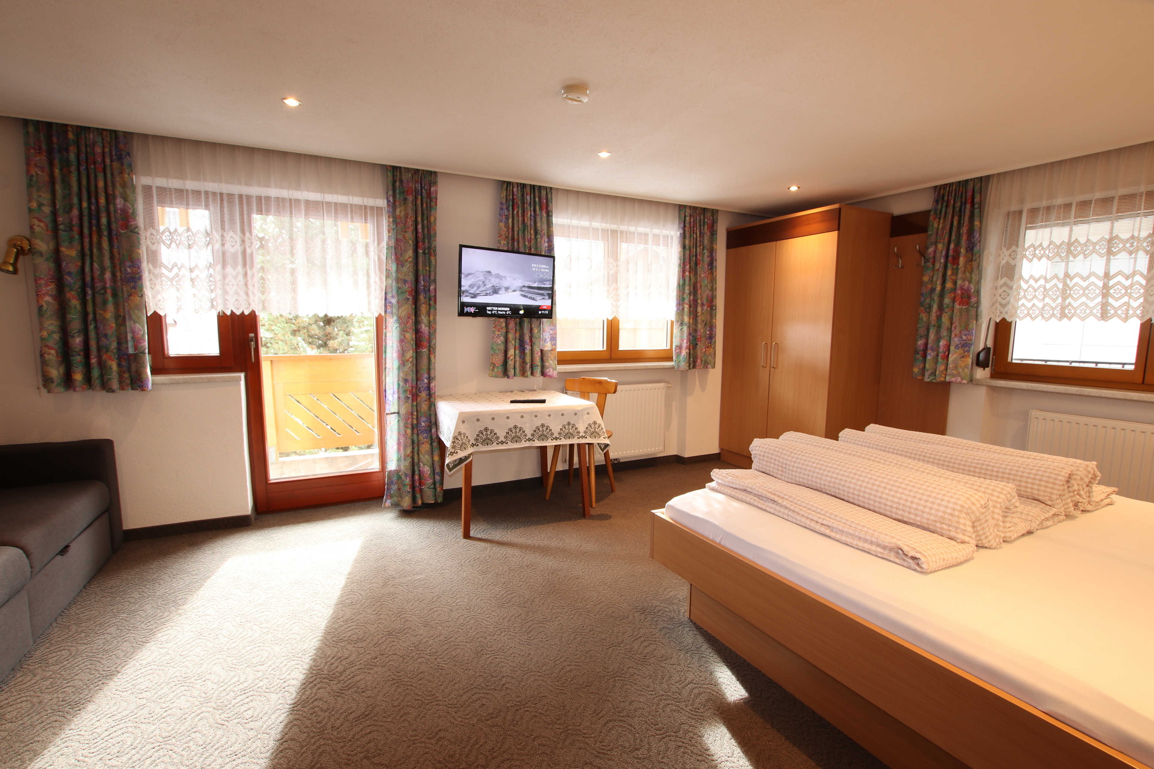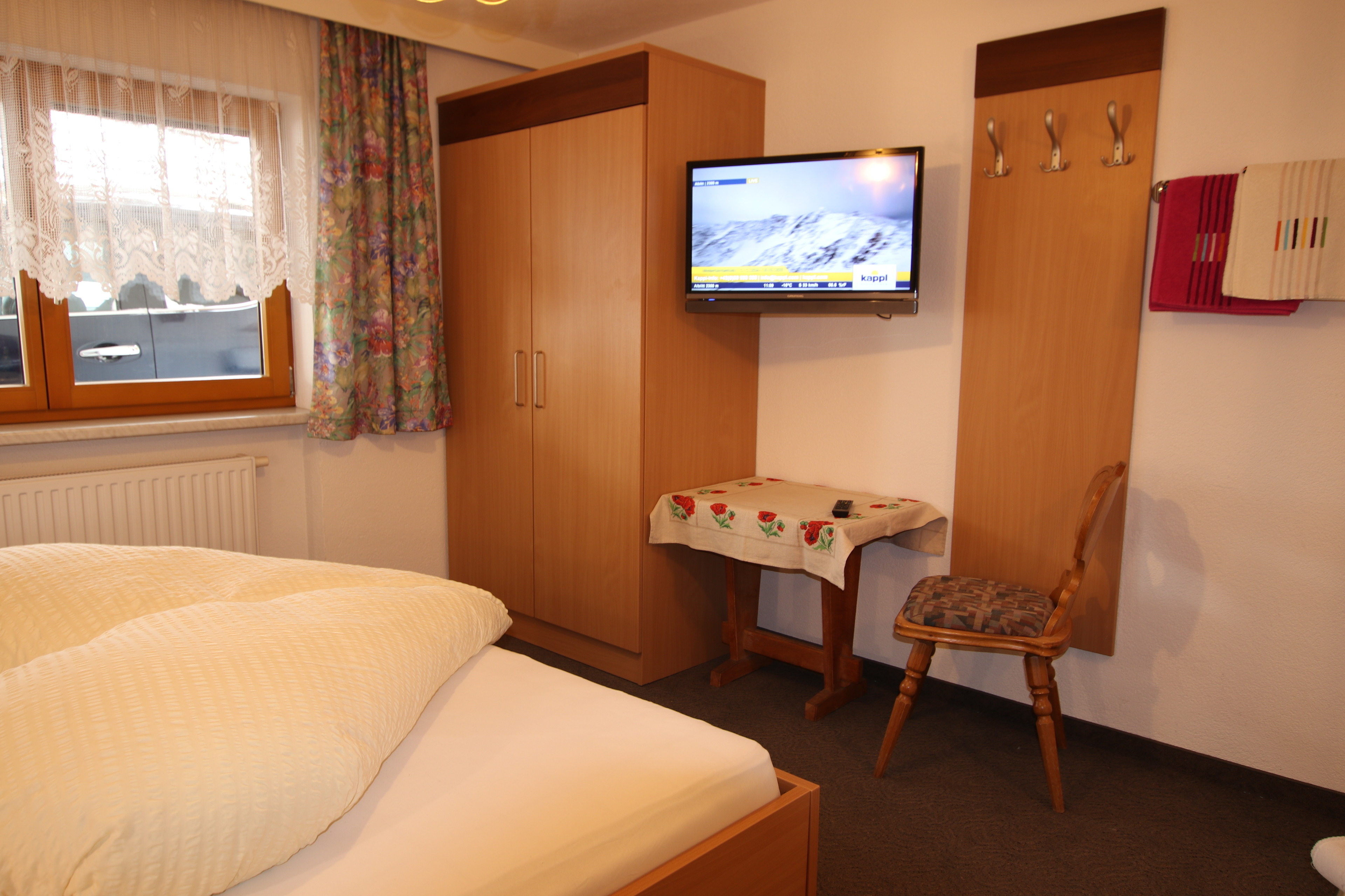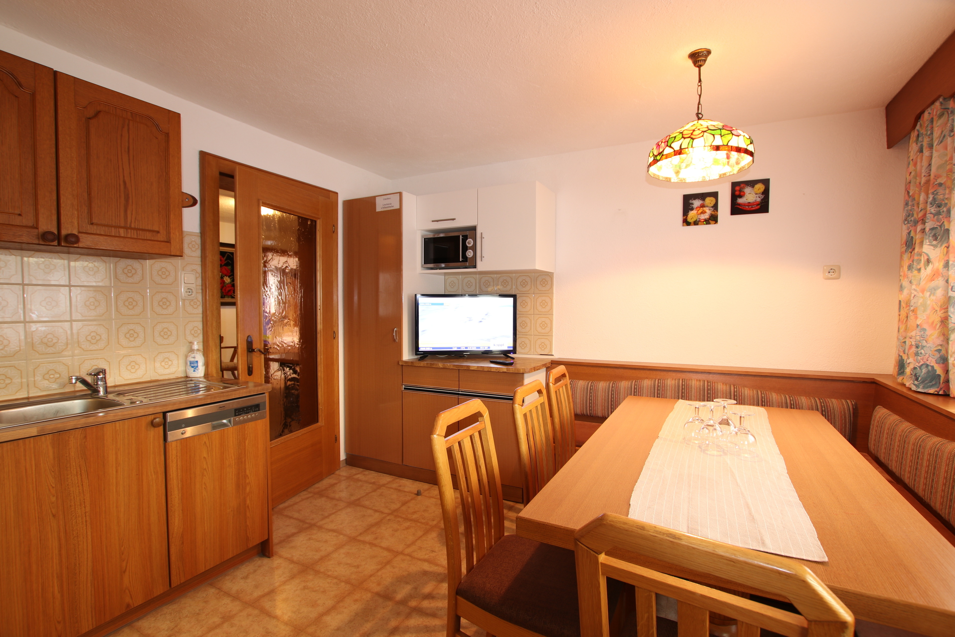 4-Zimmer-Ferienwohnung im Erdgeschoß mit ca. 90 m² Wohnfläche im Zentrum von Kappl im Paznauntal, nur 10 Autominuten bis Ischgl (Gratis-Skibusverbindung). Eingang in großen Flur mit Garderobe. Wohnküche (4 Ceranfelder, Backofen, Mikrowelle, Geschirrspüler, 2x Kaffeemaschine, Wasserkocher, Toaster, Kühlschrank mit kleinem Gefrierfach) mit Essplatz (Eckbank) und Sat-TV. Doppelzimmer mit Duschkabine, Waschbecken, Haartrockner, Sat-TV und Balkonausgang. Weiteres Doppelzimmer. Schlafzimmer mit Doppelbett, Bettcouch, Duschkabine, Waschbecken, Haartrockner, Sat-TV und Balkonausgang. Großes Badezimmer mit Badewanne, Dusche, WC. Separates WC.