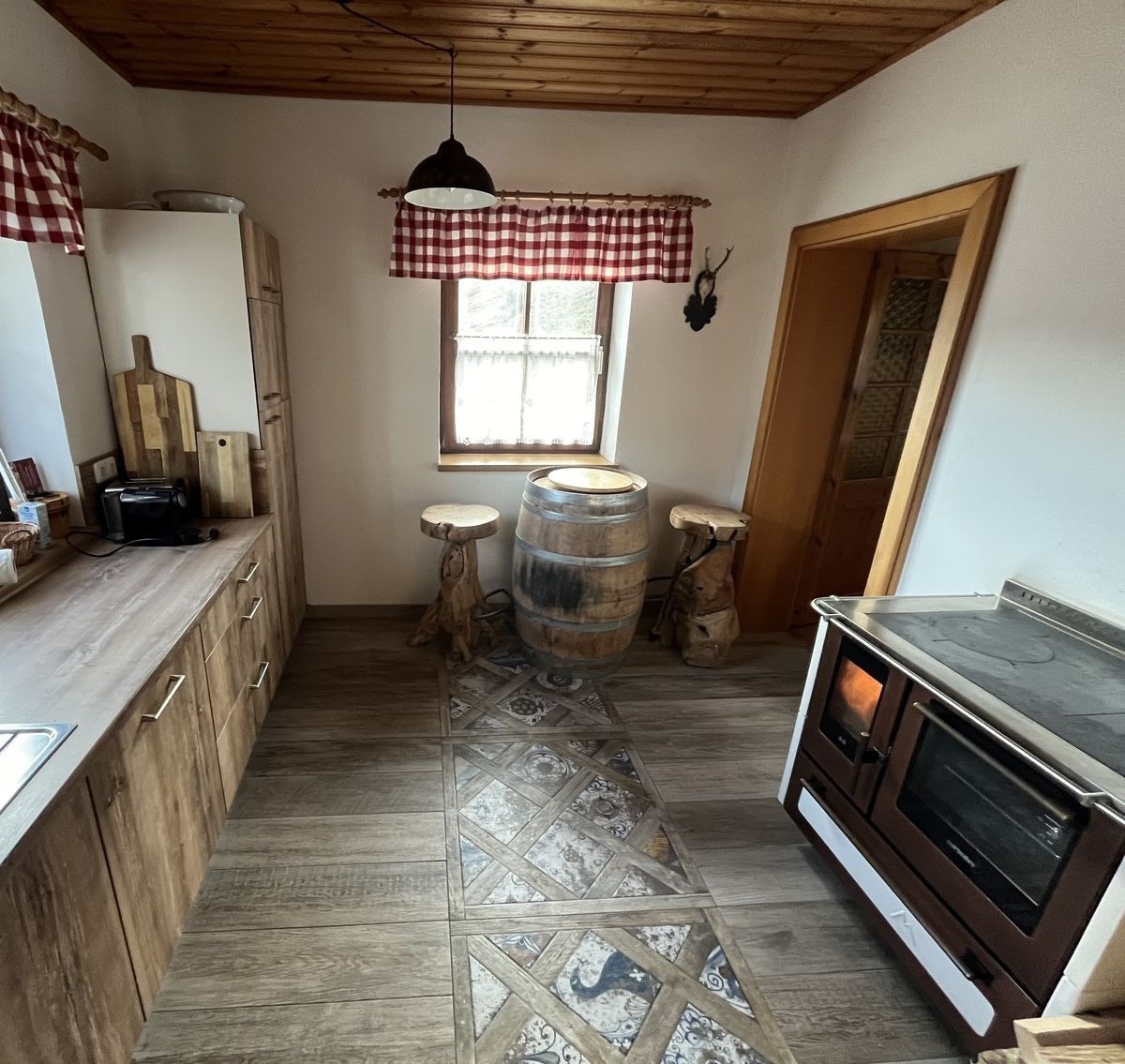 Küche mit Elektroherd & Backofen, Holzofenherd, Kühlschrank mit Gefrierfach, Geschirrspüler, Toaster, Kaffeemaschine & Wasserkocher