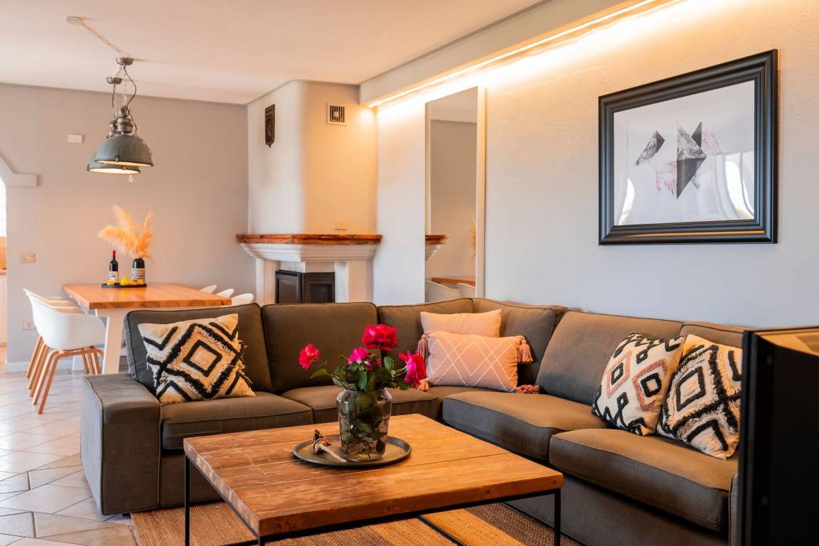 Große, gut ausgestattete Küche offen zum Wohnzimmer mit großzügigem Sofa
