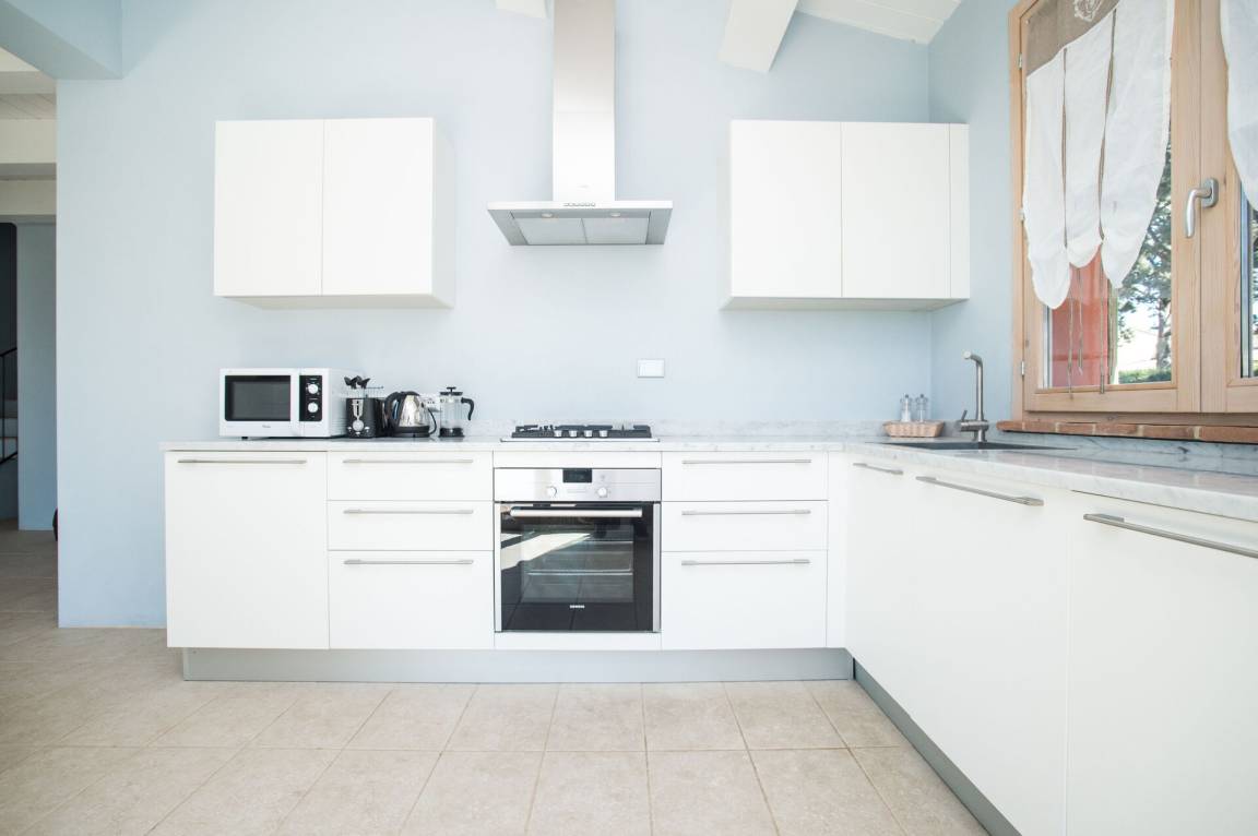 Wohnküche (60 m²): gut ausgestattete Küche, Esstisch, Spülmaschine, Kühlschrank, Tiefkühler, Mikrowelle, Herd, Ofen, Italienische Kaffeemaschine, drei Sofas, WiFi Internet, Klimaanlage, TV, behindertengerecht, CO2 Detektor, Ausgang auf den Garten.