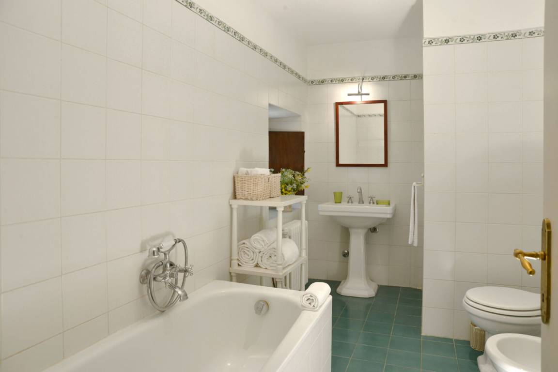 Schlafzimmer mit Bad: Doppelbett, WiFi Internet, Waschbecken, WC, Bidet, Badewanne, Fön, Ausgang auf den Balkon.