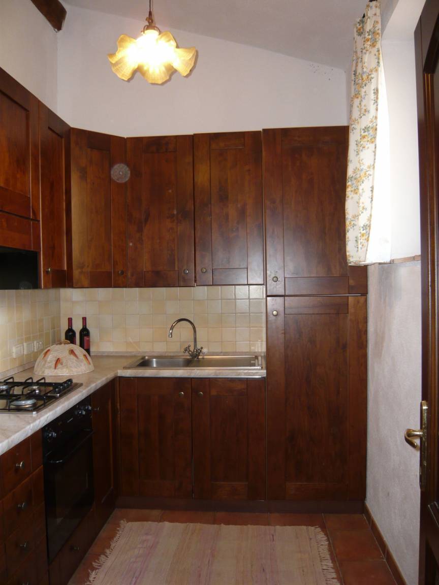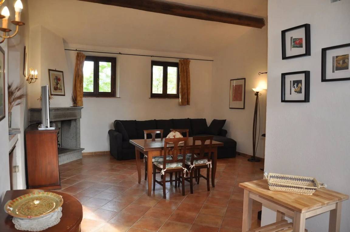 Erdgeschoss: Wohnzimmer mit Kamin und Essbereich, Küche, Bad mit Dusche.
