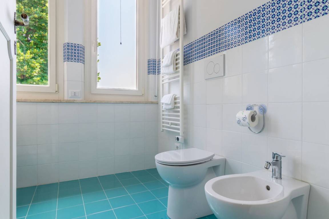 Badezimmer 2: Waschbecken, WC, Bidet, Dusche.