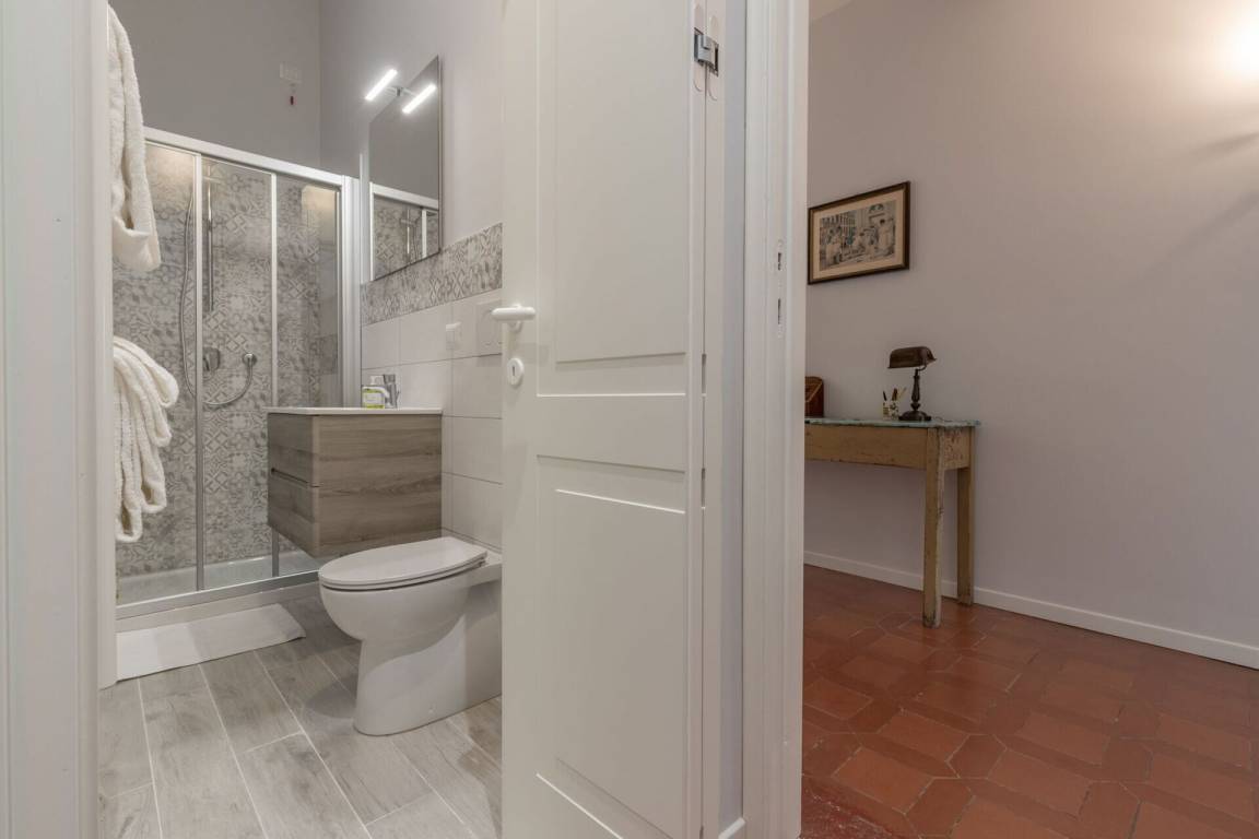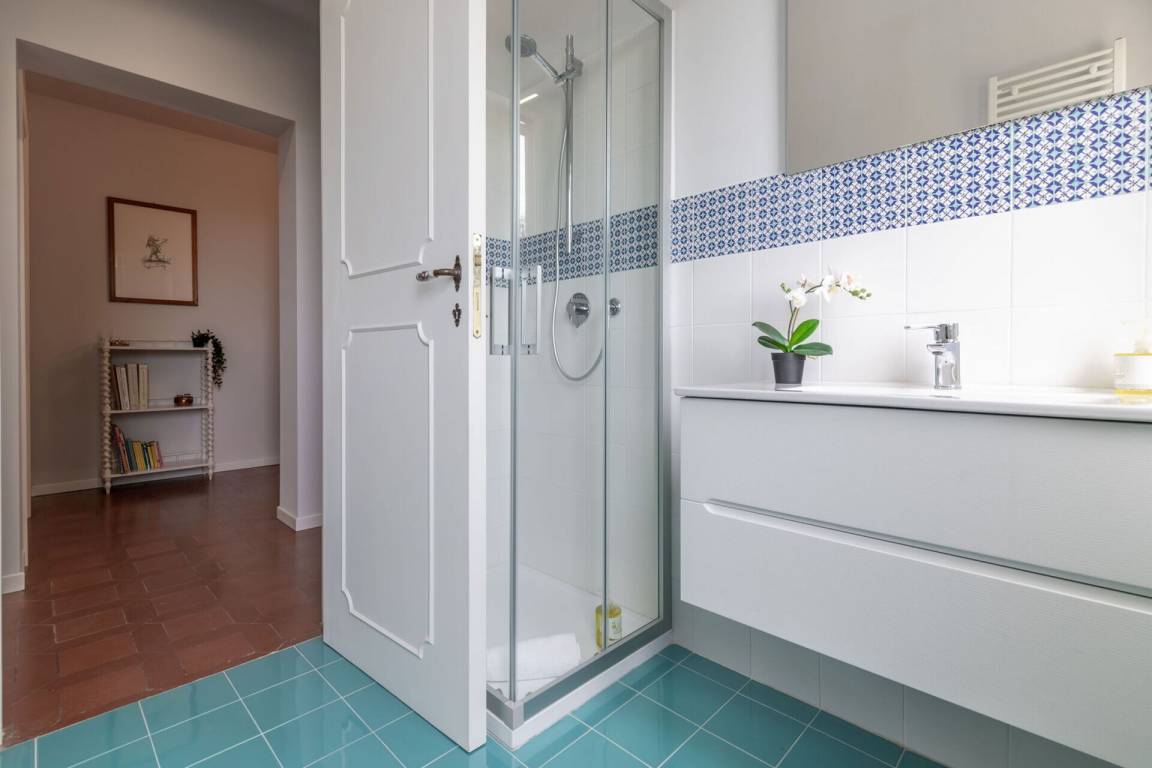 Badezimmer 1: Waschbecken, WC, Bidet, Dusche.