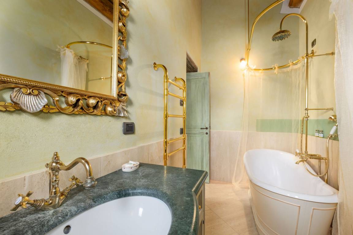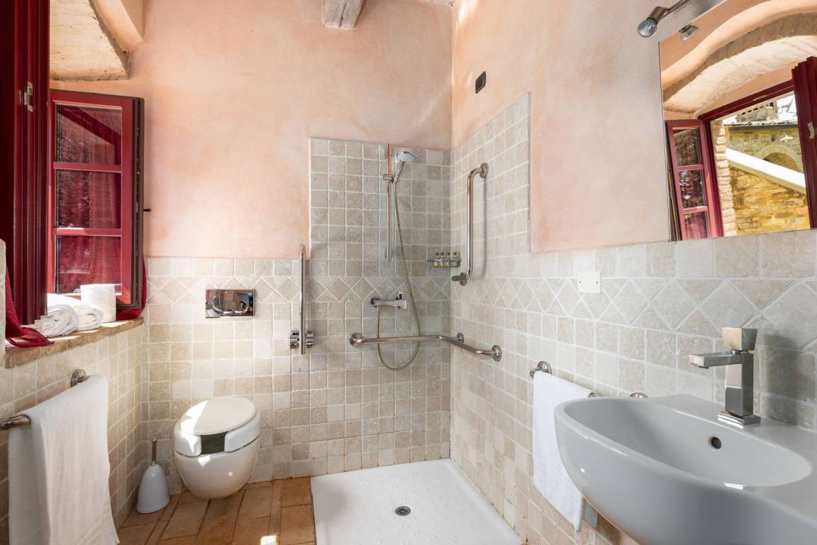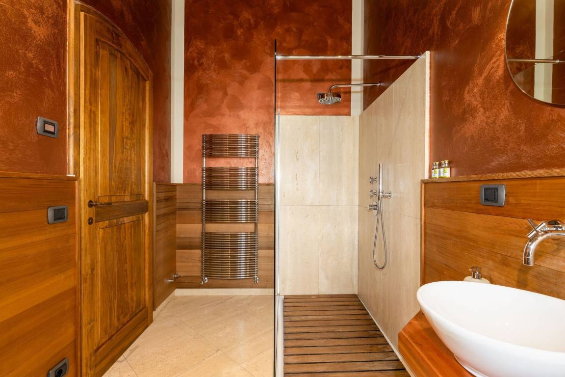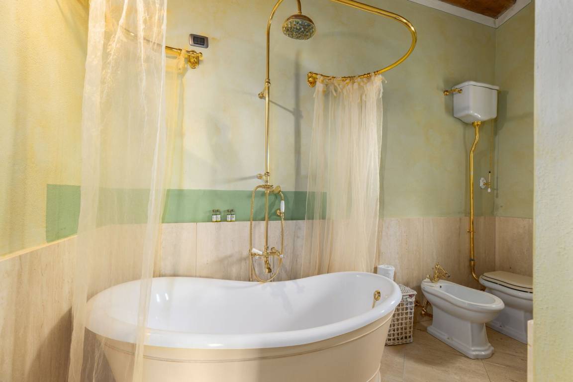 Erster Stock: Großes Doppelzimmer mit offenem Bad mit Hydromassage- Dusche.