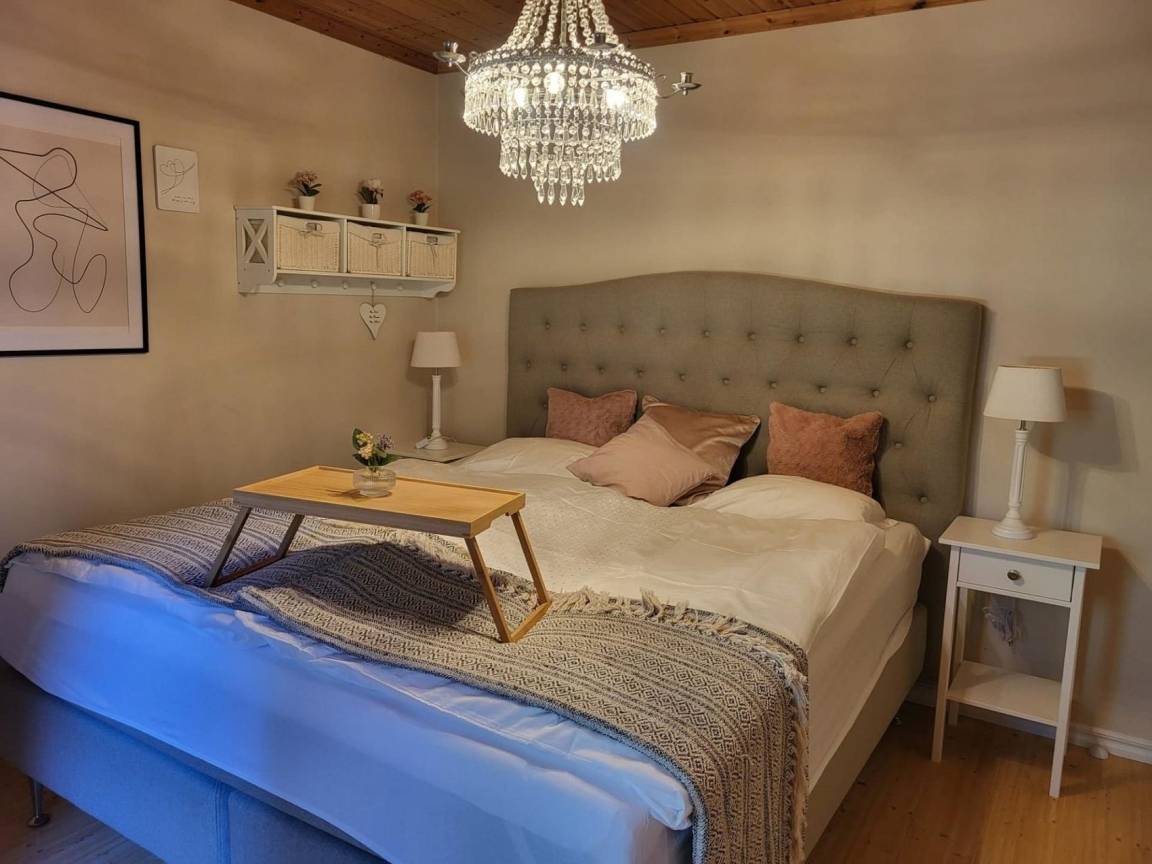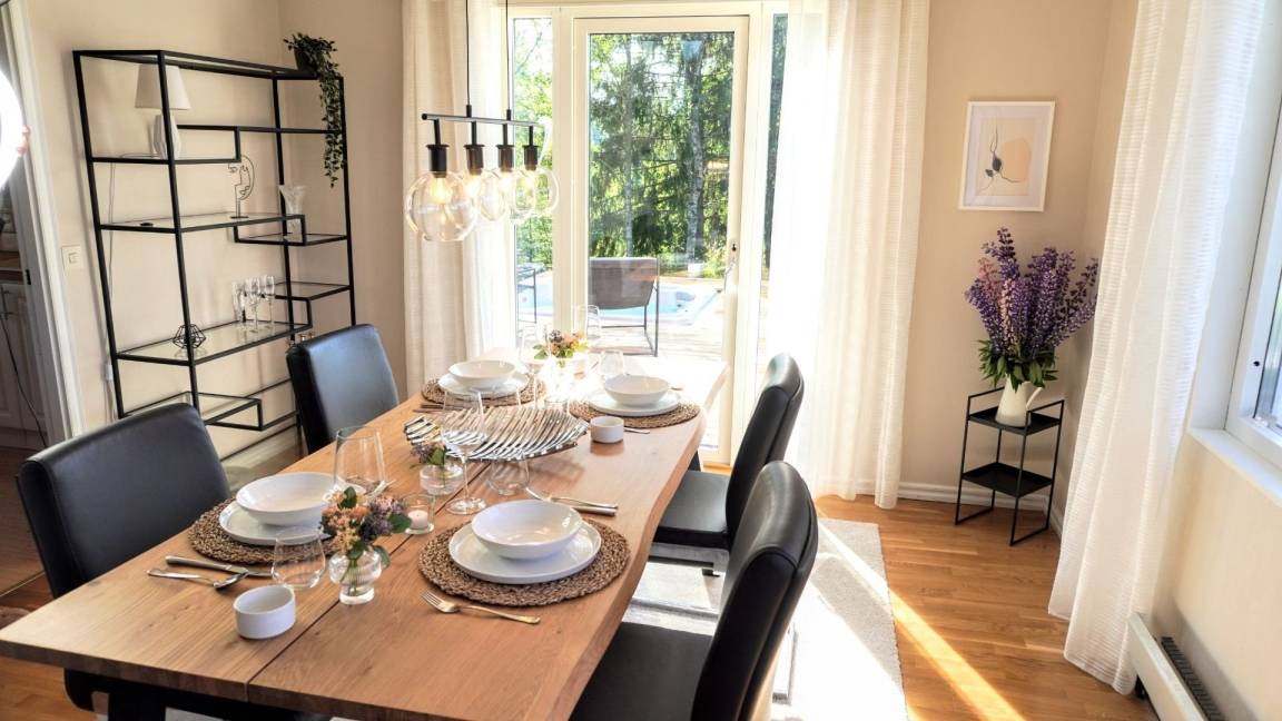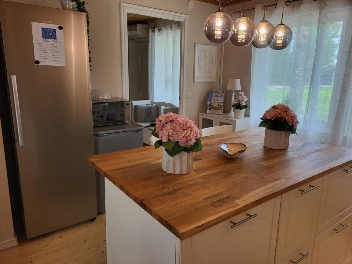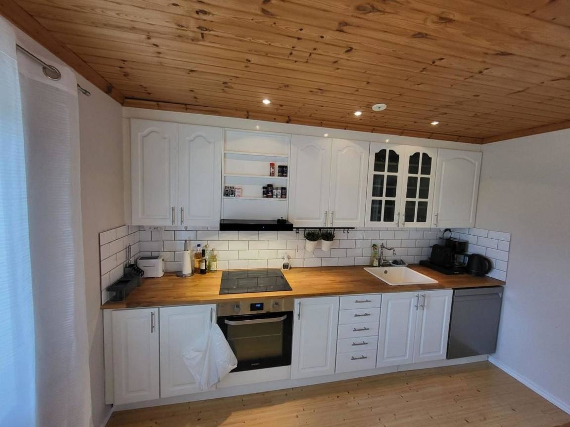 Das typische Schwedenhaus hat einen offenen Wohn-/Essbereich mit angrenzender Küche. Die Einrichtung ist modern (Induktionsherd, Geschirrspüler, Waschtrockner und vieles mehr) und gemütlich. Eine große Fensterfront ermöglicht einen Blick auf die angrenzende Wiese und das Sofa lädt zum Faulenzen und Fernsehen ein. Der Essbereich hat einen direkten Zugang zur Terrasse, wo auch ein Whirlpool vorhanden ist.