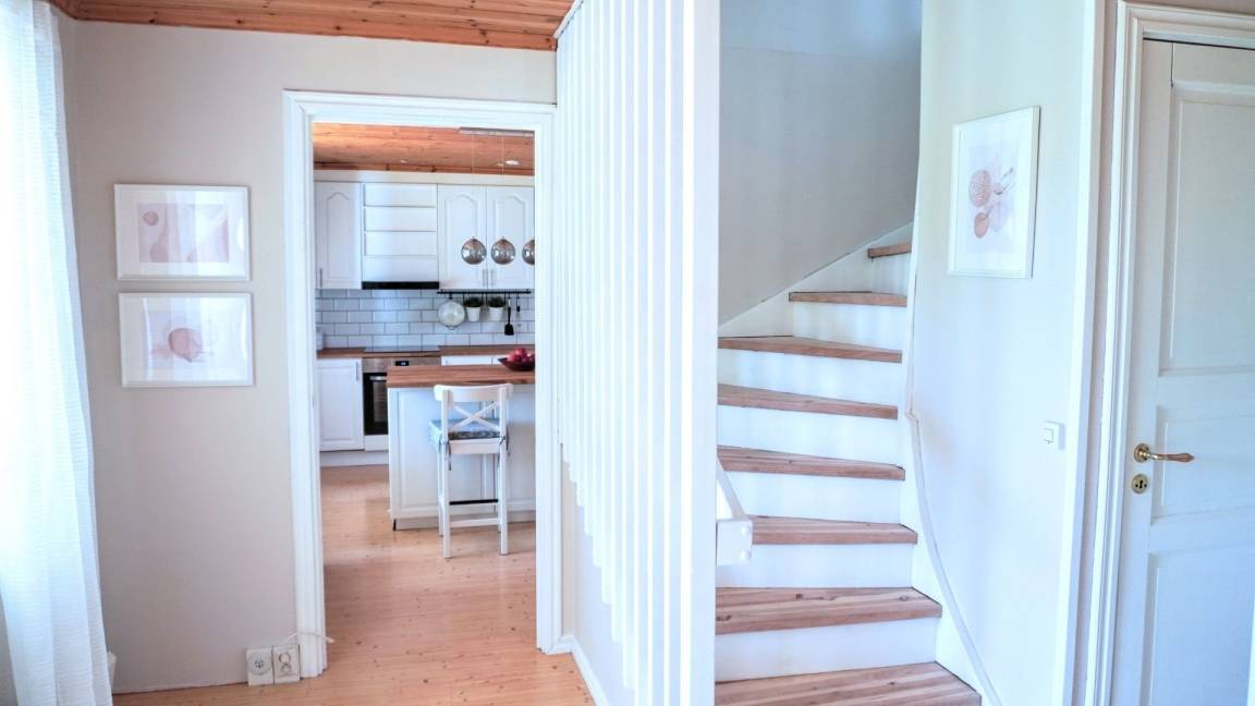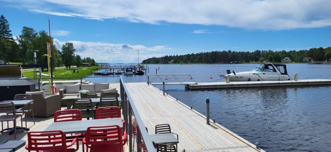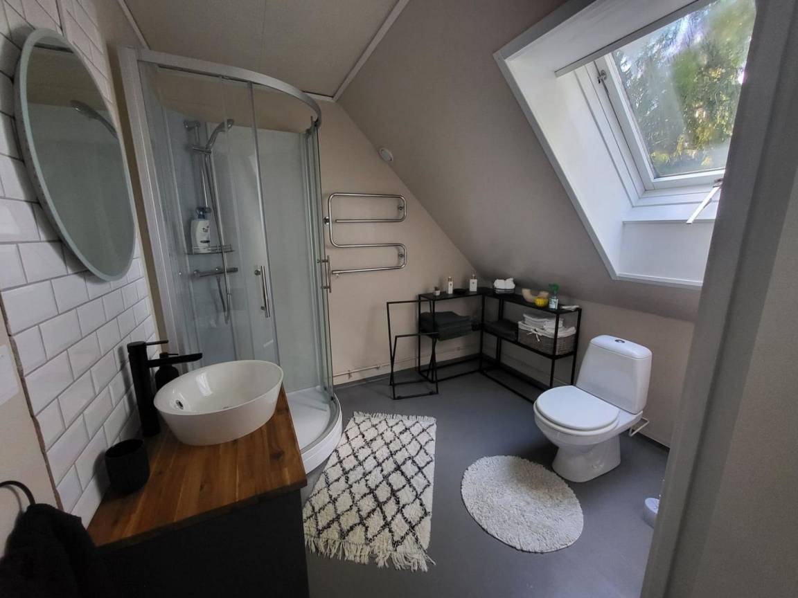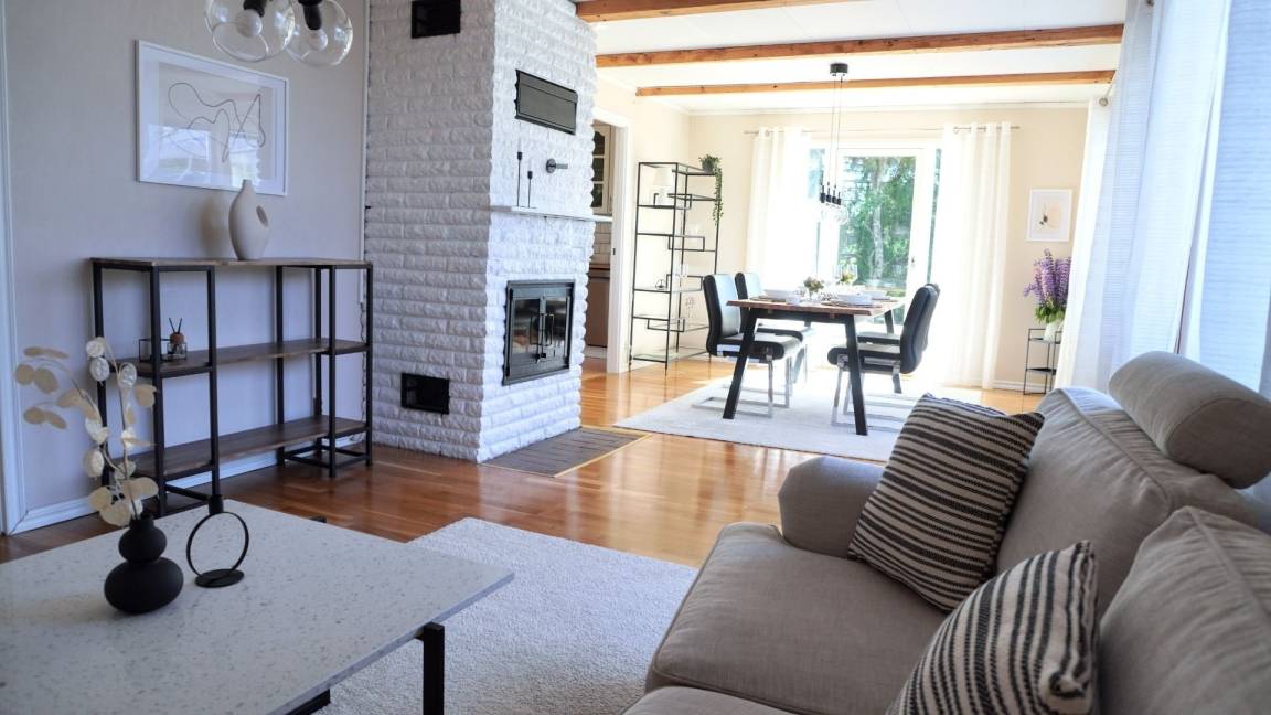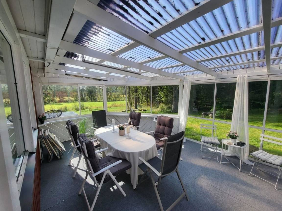 Das typische Schwedenhaus hat einen offenen Wohn-/Essbereich mit angrenzender Küche. Die Einrichtung ist modern (Induktionsherd, Geschirrspüler, Waschtrockner und vieles mehr) und gemütlich. Eine große Fensterfront ermöglicht einen Blick auf die angrenzende Wiese und das Sofa lädt zum Faulenzen und Fernsehen ein. Der Essbereich hat einen direkten Zugang zur Terrasse, wo auch ein Whirlpool vorhanden ist.