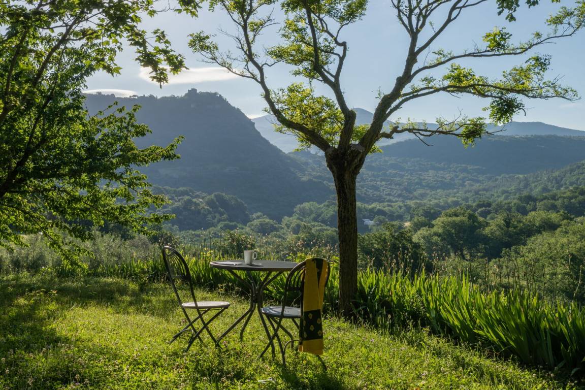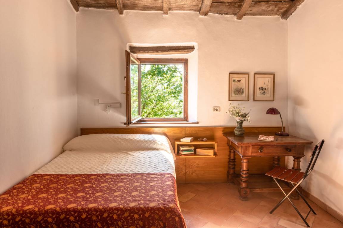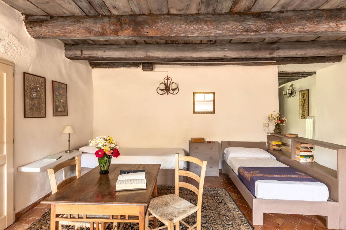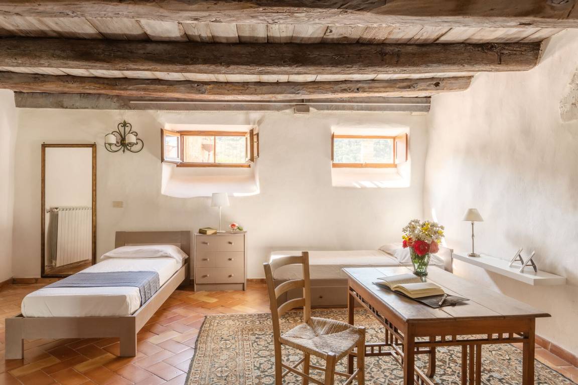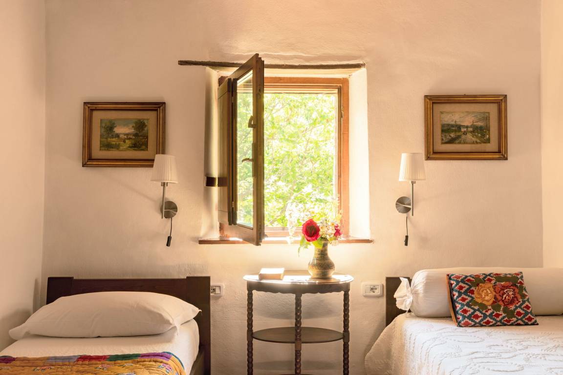 Schlafzimmer mit Bad 3: zwei Einzelbetten, WiFi Internet, Schreibtisch, Waschbecken, WC, Dusche, Fön, Ausgang auf den Garten.