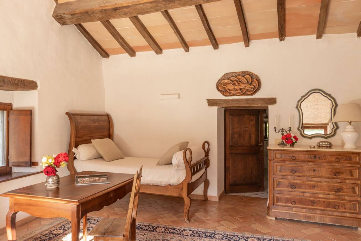 Schlafzimmer mit Bad 2: zwei Einzelbetten, WiFi Internet, Sessel, Schreibtisch, Waschbecken, WC, Badewanne, Dusche, Fön, Ausgang auf die Terrasse.