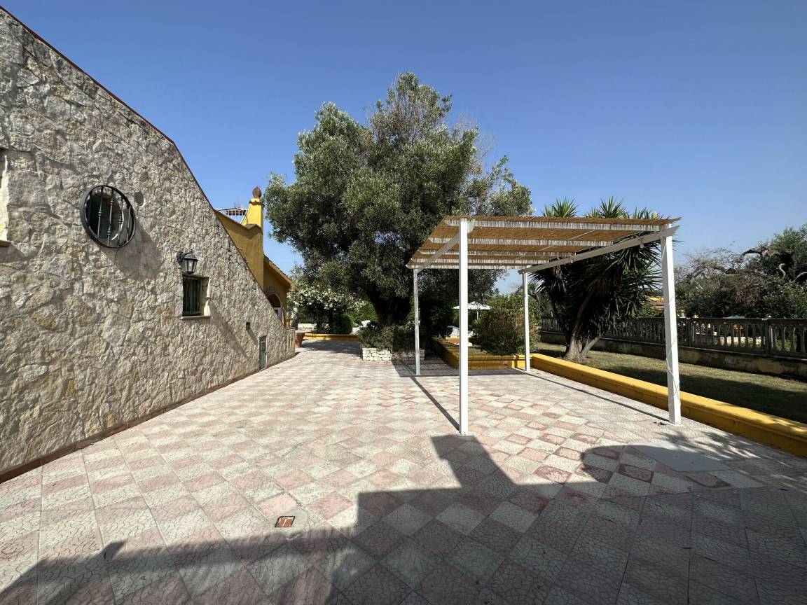 Garten: Schwimmbad, Außenbereich für das Essen im Freien, Esstisch, Pavillon, Gartenmöbel, Sonnenliege, umzäuntes Grundstück.