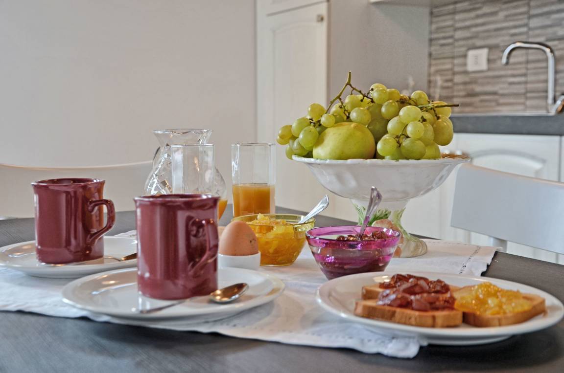 4 Stunden tiefer: Essbereich mit Küchenecke (Gefrierschrank, Spülmaschine, Backofen, elektrische Herdplatten), Doppelzimmer mit Ehebett (auf Anfrage auseinanderstellbar), Bad mit Dusche (ohne Bidet).