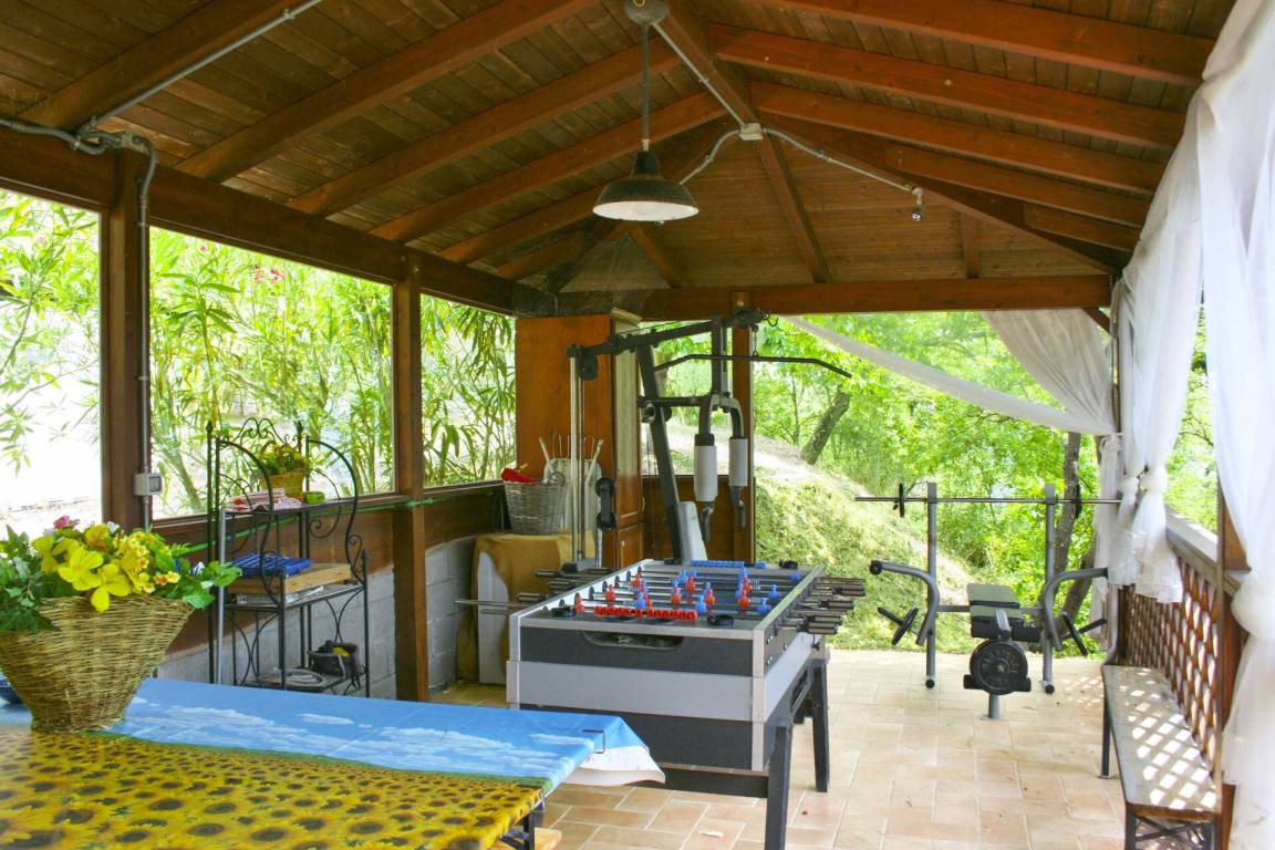 Gartenlaube mit Küche, verschiedenen Tischspielen, einem Billardtisch und Gymnastikgeräten