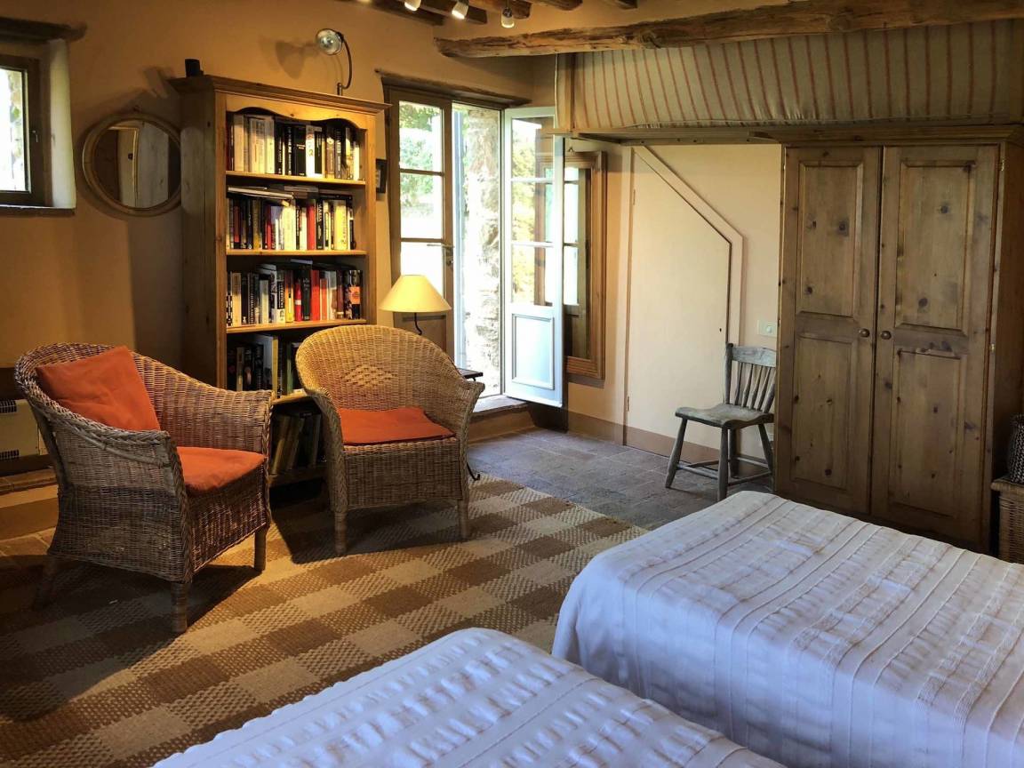 Schlafzimmer: zwei Einzelbetten, WiFi Internet, Fliegengitter, zwei Sessel, Ausgang auf den Garten.