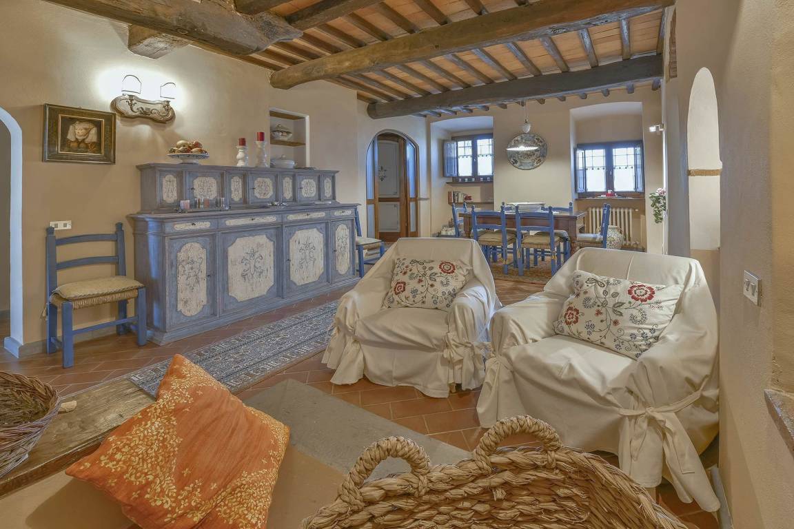 Die Küchen auf beiden Geschossen verfügen über eine Mikrowelle, eine Geschirrspülmaschine, einen elektrischen Ofen und einen Holzofen. Ein Waschraum auf dem Erdgeschoss ist mit einer Waschmaschine und einem Wäschetrockner ausgestattet. Klimaanlage und Heizung sorgen für Temperaturkontrolle das ganze Jahr über. Das Wohnzimmer ist mit einem Satelliten-Flachbildfernseher ausgestattet. Die private Terrasse und die Außenbereiche sind mit Gartenmöbeln, Sonnenliegen, Sonnenschirmen, Außensofas und Sesseln möbliert; ein Grill befindet sich im gepflasterten Bereich unter der Pergola und ist mit Tisch und Stühlen ausgestattet. Das private Schwimmbad misst 12 x 6 Meter mit einer Tiefe von 140 bis 150 cm und verfügt über einen Umkleideraum, eine Toilette und eine externe Dusche.