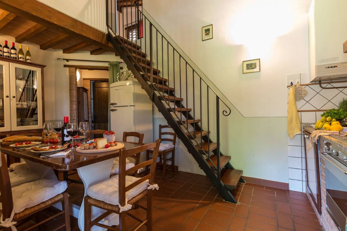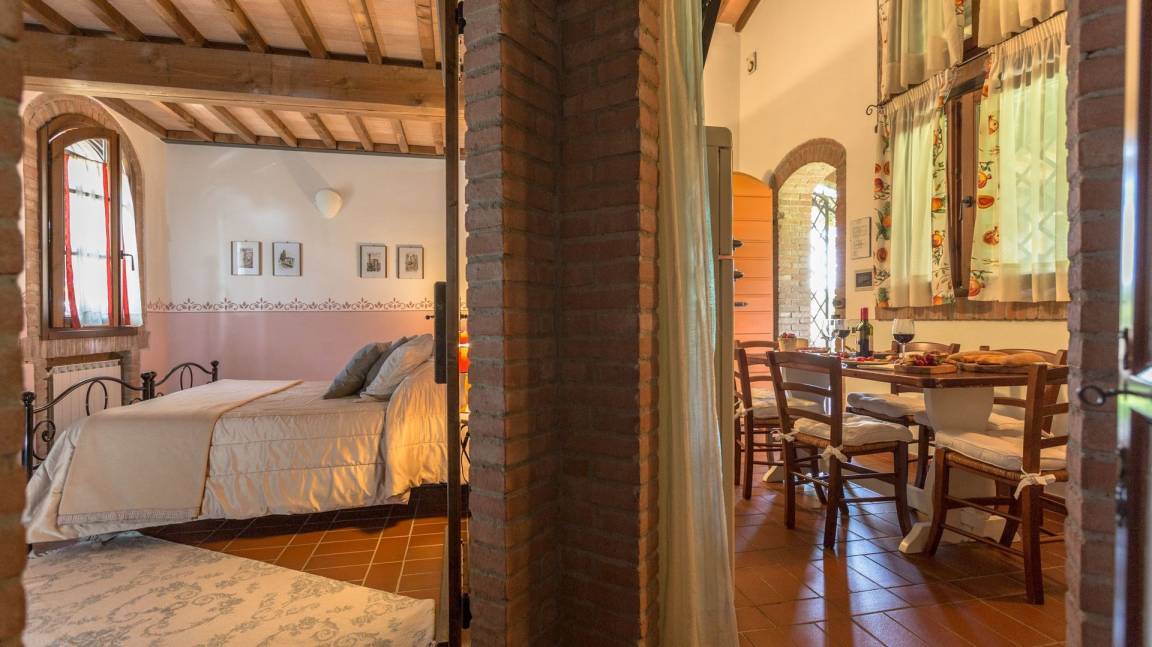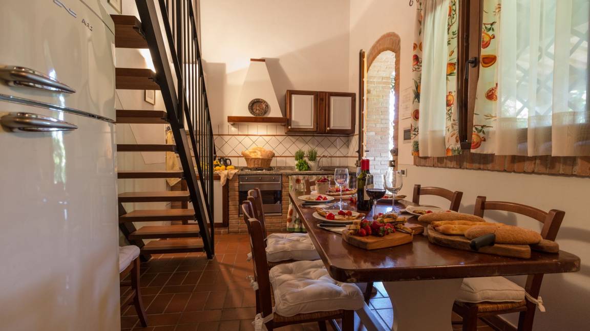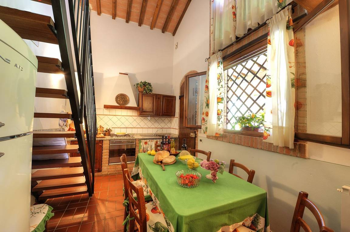 Erdgeschoss: Wohnzimmer mit Esstisch. Kochecke (Backofen, Kühlschrank), Doppelzimmer (die Betten können getrennt gestellt werden) mit Einzelschlafcouch, Bad mit Dusche.