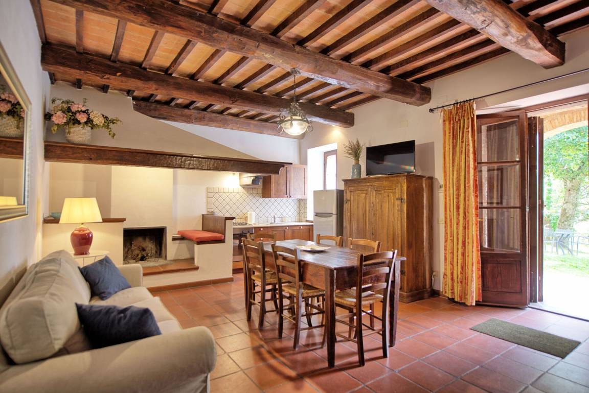 Erdgeschoss: Wohnzimmer mit Essbereich, Kamin und Kochecke, Doppelzimmer mit Ehebett, Bad mit Dusche.