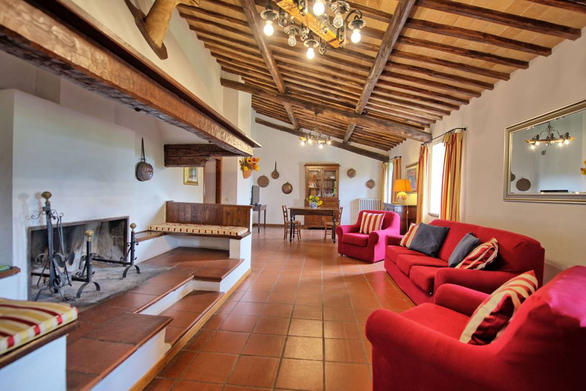 Erster Stock: Wohnbereich mit großem Wohnzimmer (60 m²) mit Kamin, Esszimmer und Küche, Doppelzimmer mit Ehebett und privatem Bad mit Dusche, Doppelzimmer mit Ehebett und privatem Bad mit Dusche, Doppelzimmer mit Ehebett, Zweibettzimmer, Bad mit Dusche.