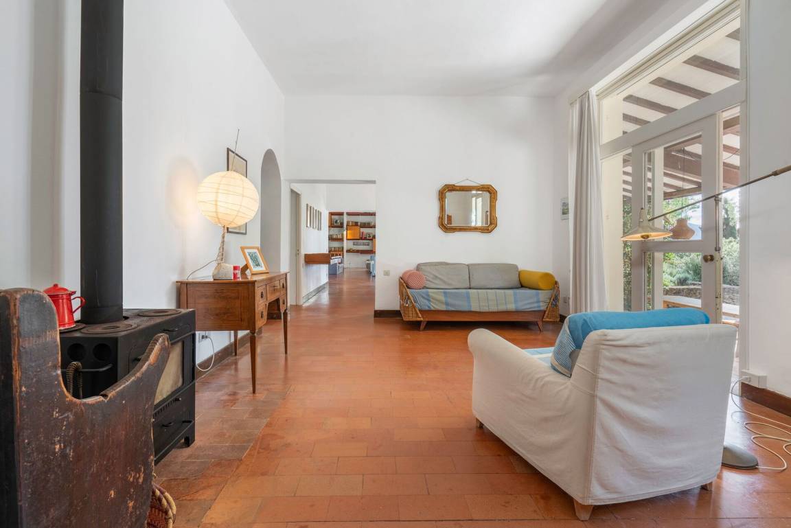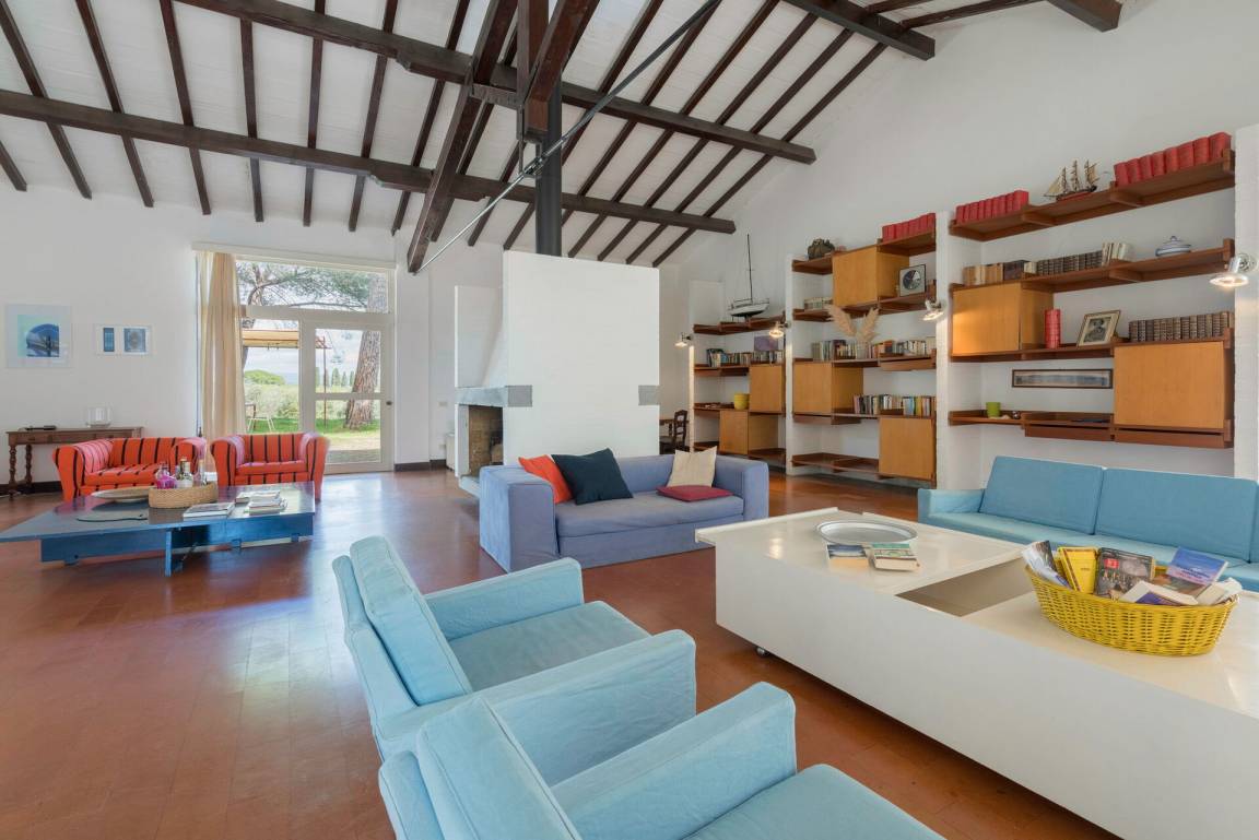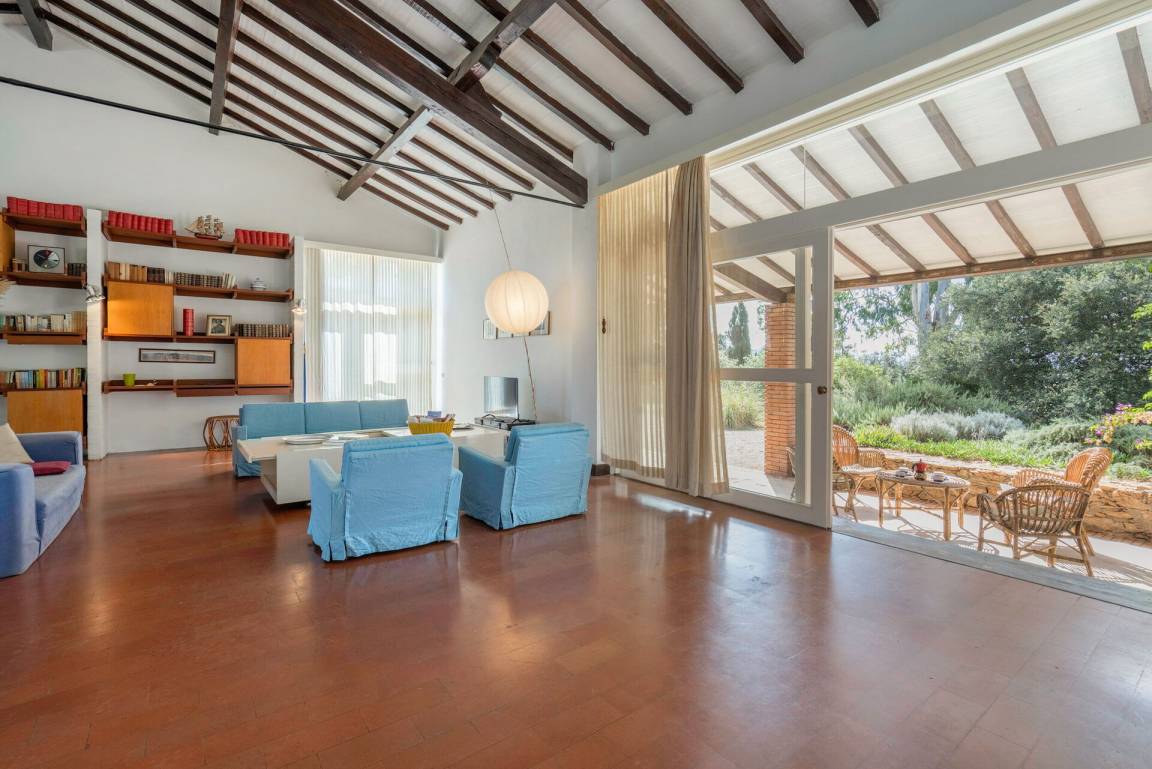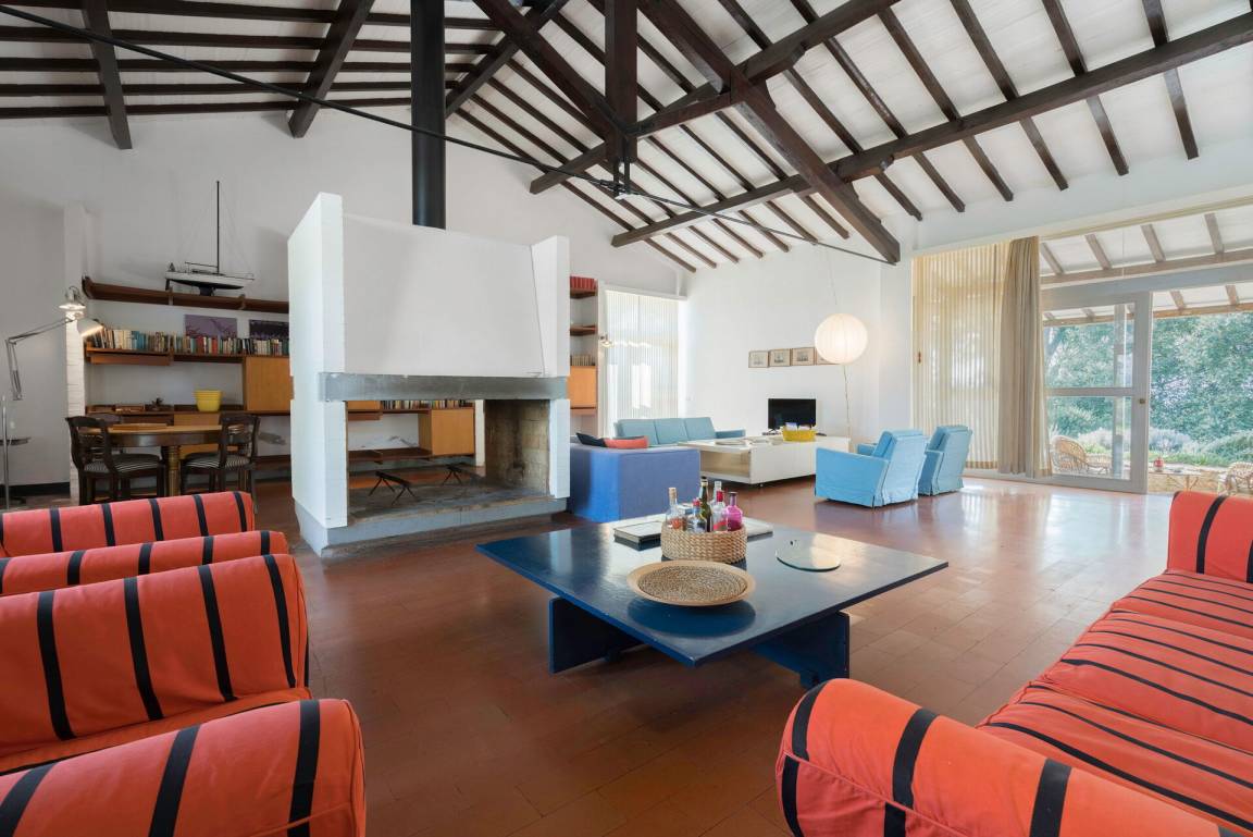 Wohnzimmer 1: drei Sofas, vier Sessel, TV, Ausgang auf den Garten.