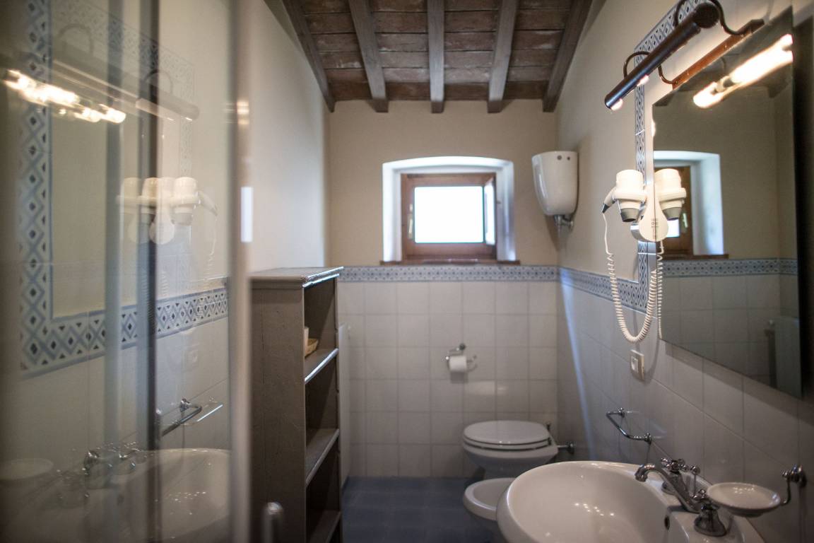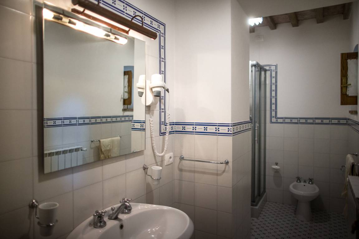 Schlafzimmer mit Bad 3: zwei Einzelbetten, WiFi Internet, Klimaanlage, Waschbecken, WC, Bidet, Dusche.