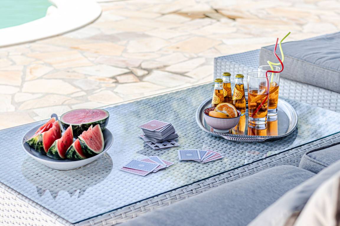 Das Anwesen verfügt über einen Billardtisch, der gleichzeitig als Esstisch für 10 Personen im Wohnbereich des Erdgeschosses dient. Der Swimmingpool ist zu Ihrer Sicherheit vollständig eingezäunt. Die Außenterrassen im ersten Stock bieten exklusive Panoramablicke auf die Landschaft.