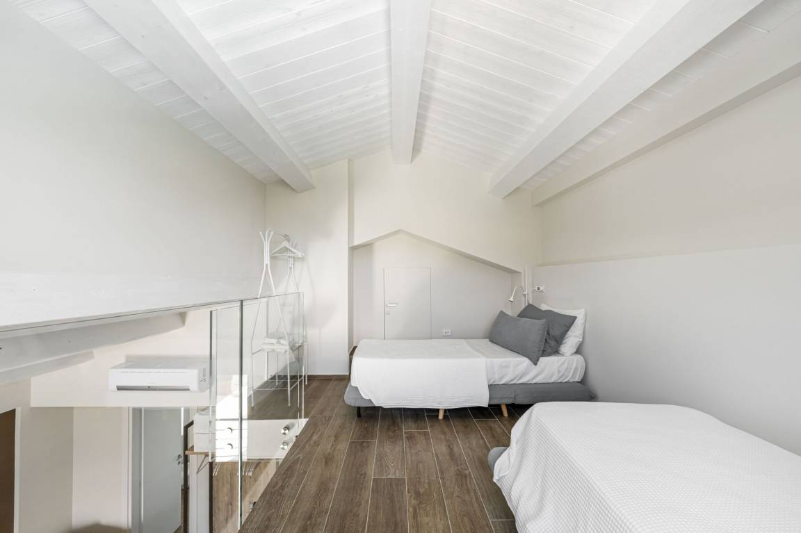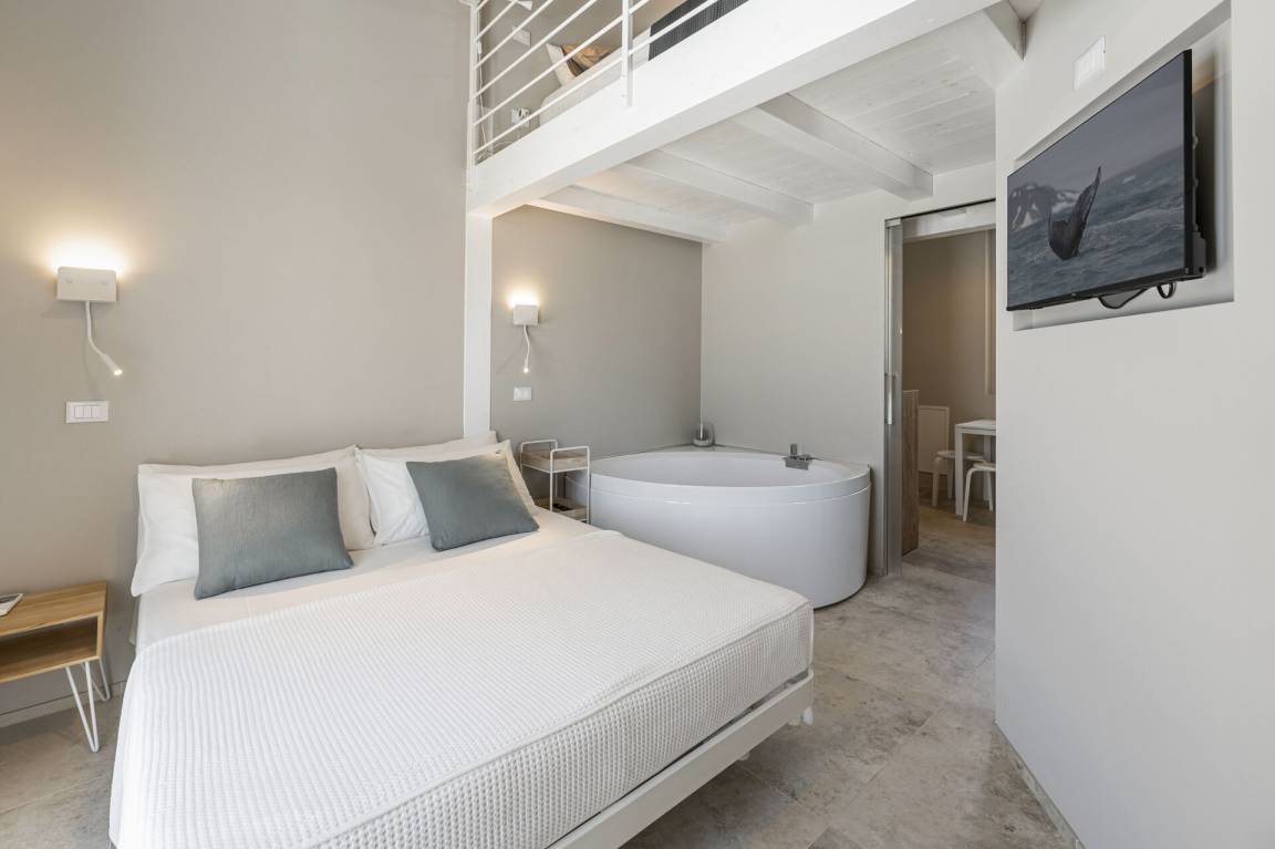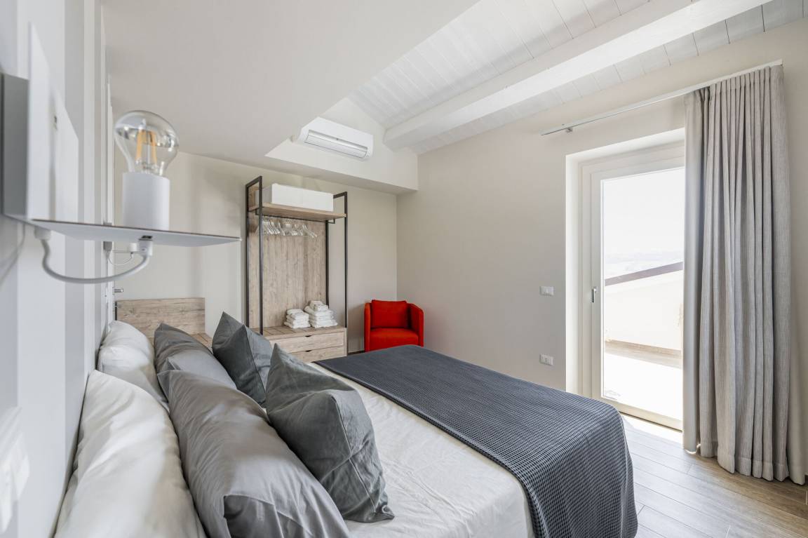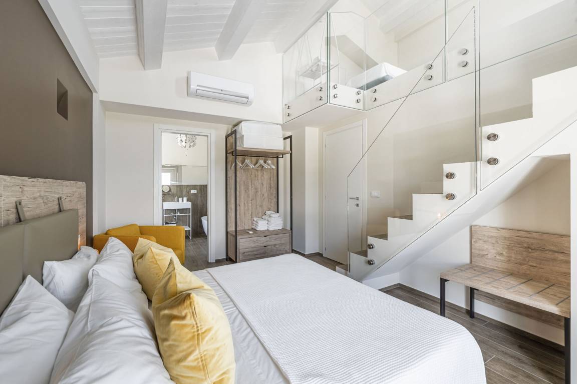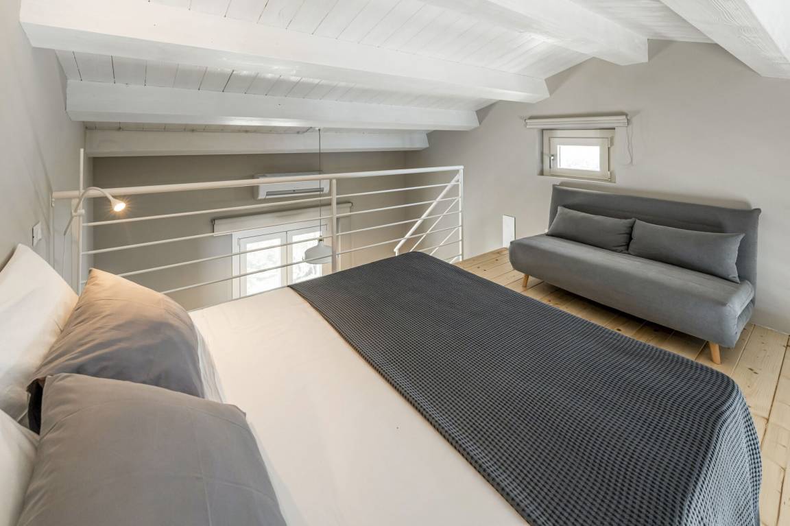 Schlafzimmer mit Bad 5: Doppelbett, WiFi Internet, Klimaanlage, Fliegengitter, Sofa, Waschbecken, WC, Bidet, Dusche, Galerie.