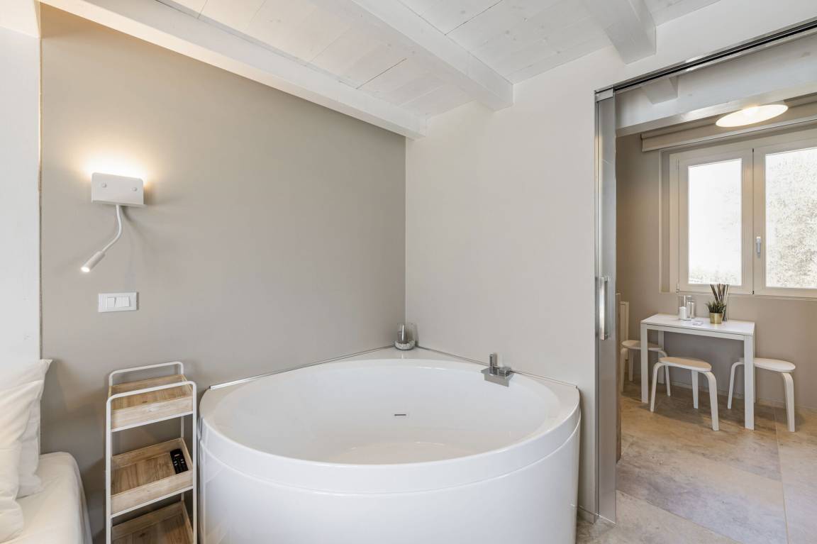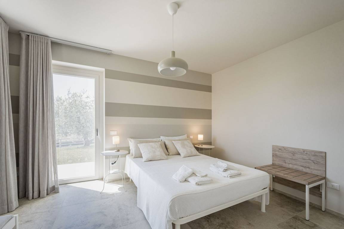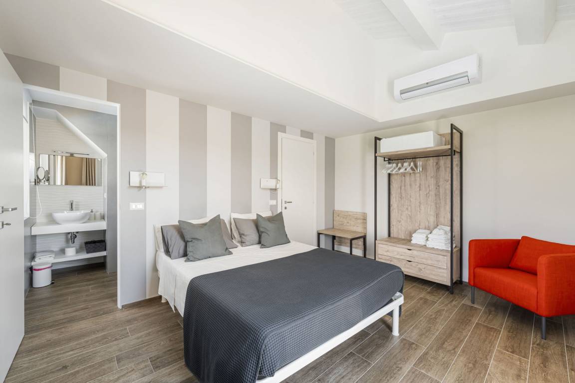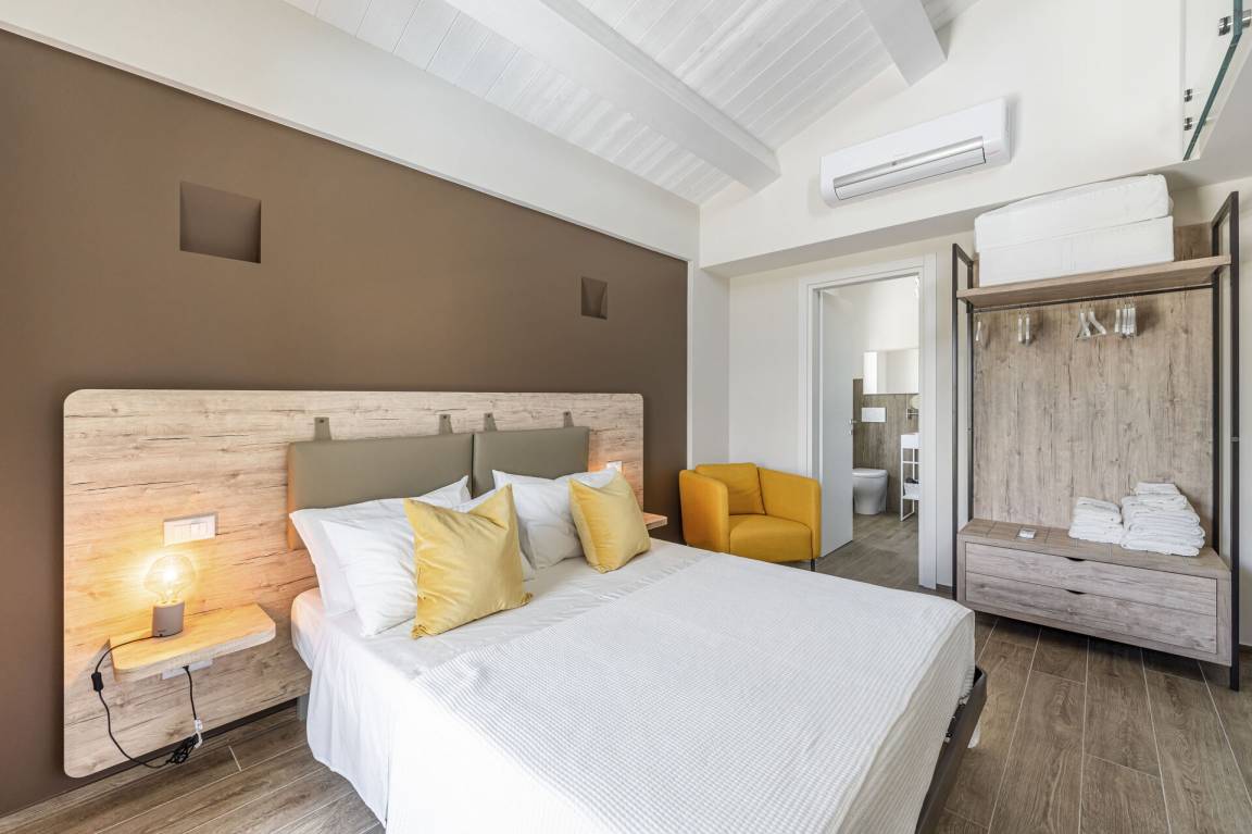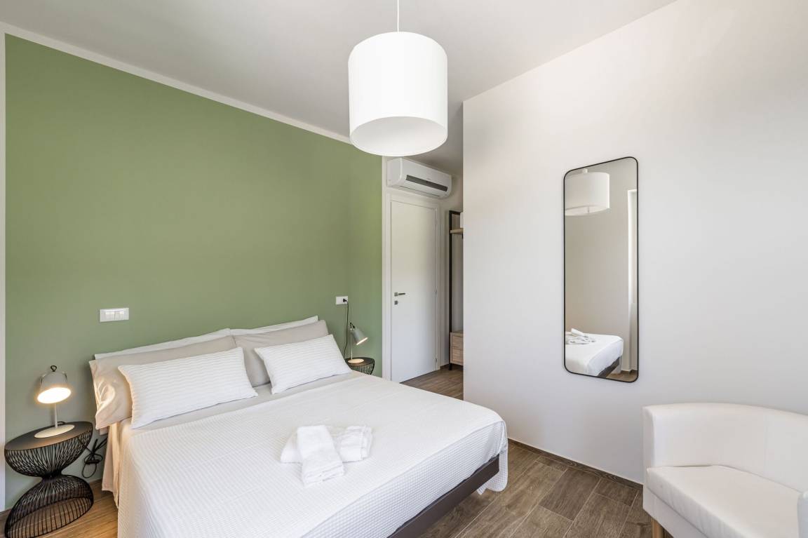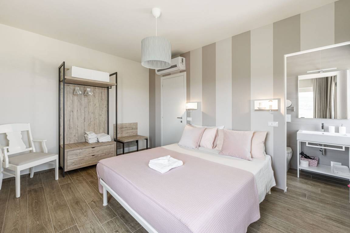 Schlafzimmer mit Bad: Doppelbett, WiFi Internet, Klimaanlage, Fliegengitter, Waschbecken, WC, Bidet, Dusche, Ausgang auf den Garten.