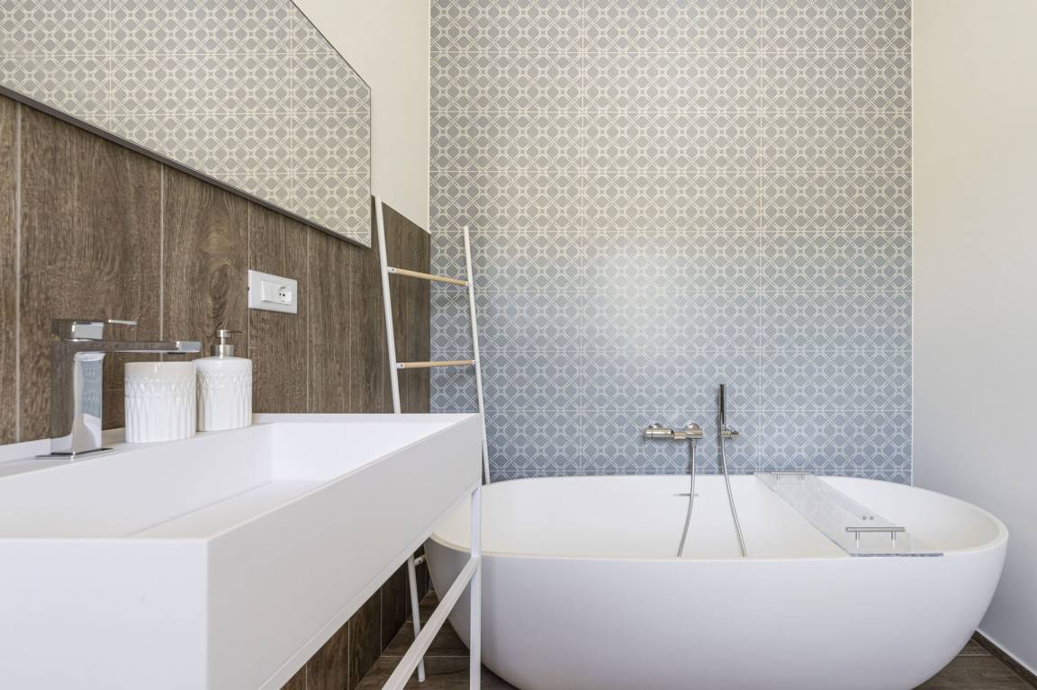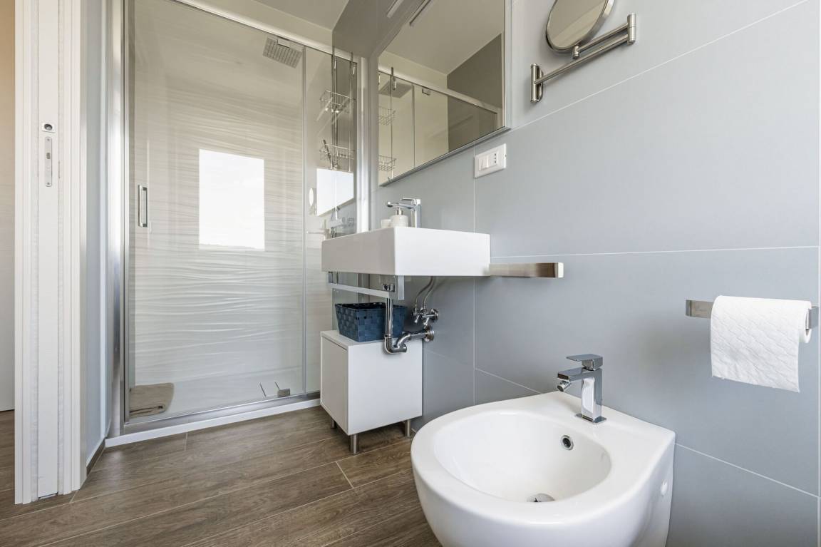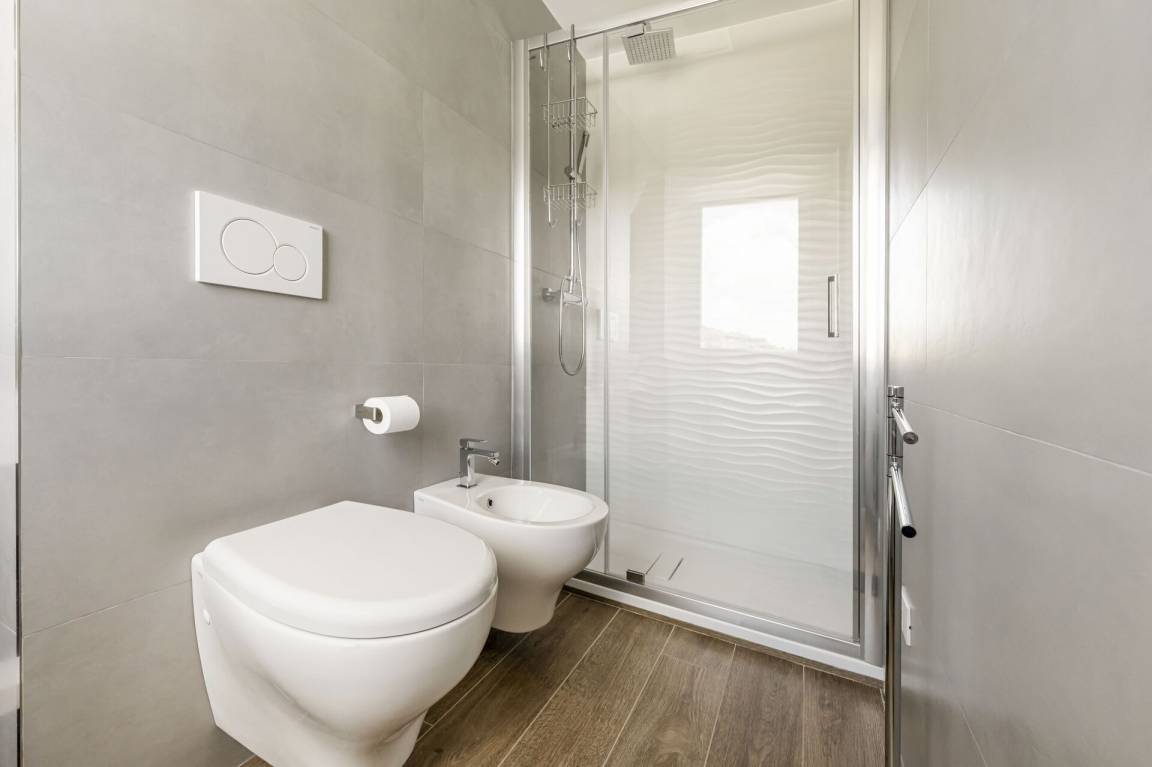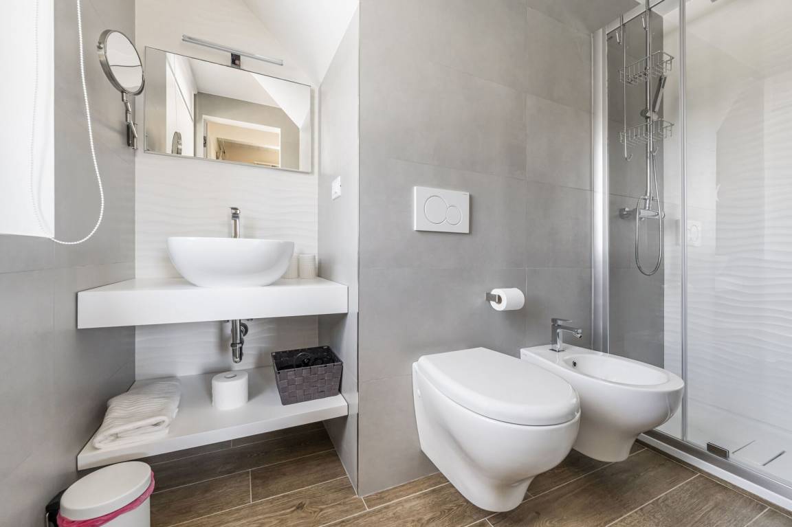 Badezimmer: Waschbecken, WC, Bidet, Dusche.