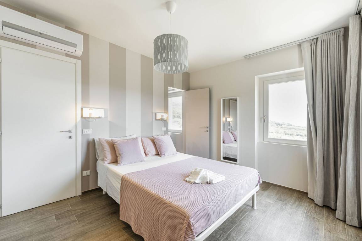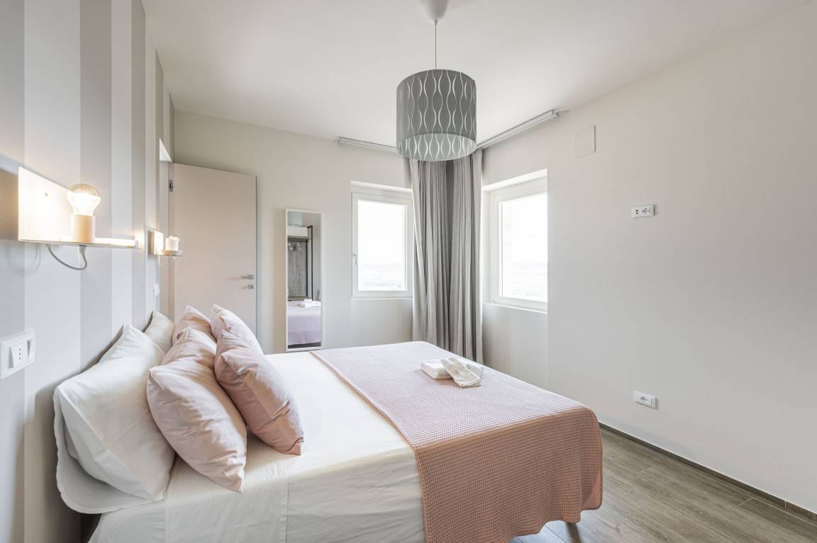 Schlafzimmer mit Bad 3: Doppelbett, WiFi Internet, Klimaanlage, Fliegengitter, Waschbecken, WC, Bidet, Dusche.