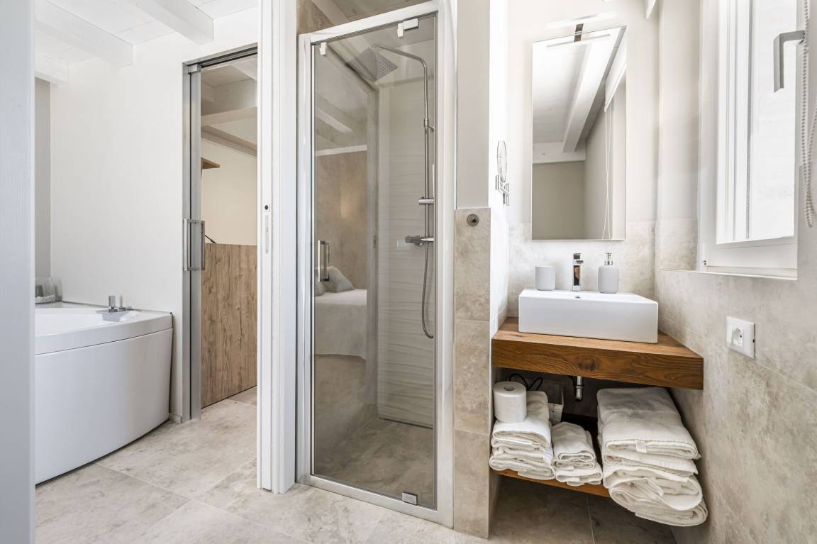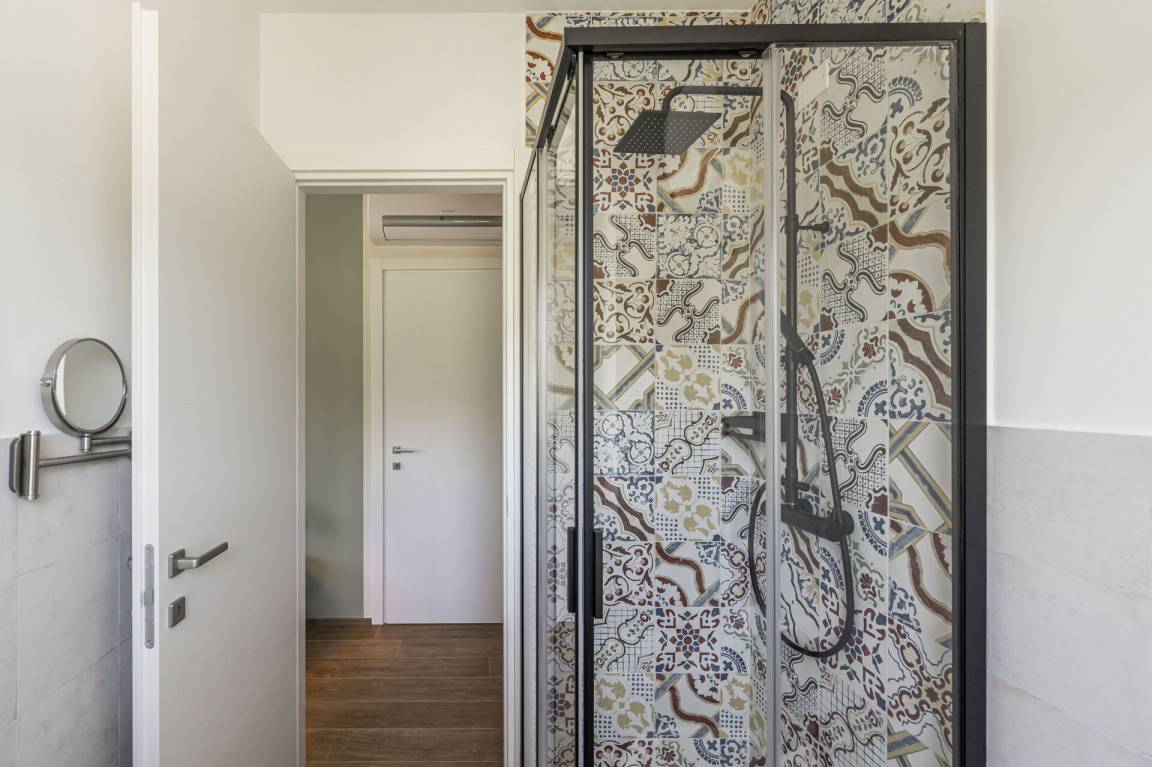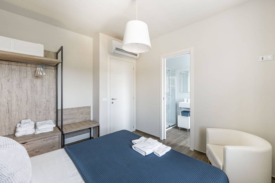 Schlafzimmer mit Bad 4: Doppelbett, WiFi Internet, Klimaanlage, Fliegengitter, Waschbecken, WC, Bidet, Dusche.