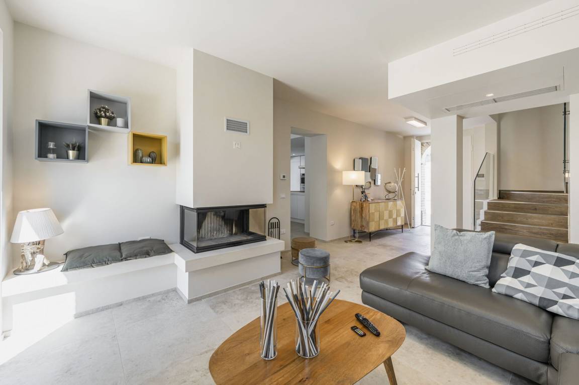 Wohnzimmer: Sofa, Kamin, TV, Fliegengitter, Ausgang auf den Garten.