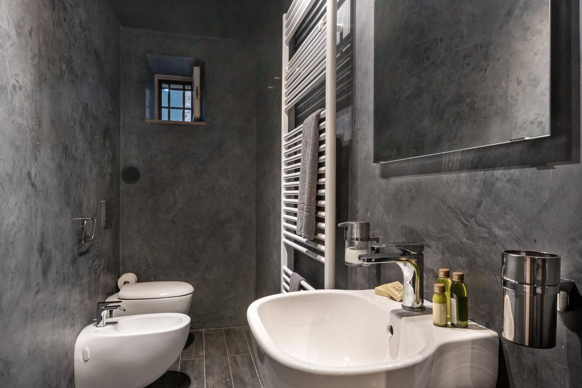 Badezimmer: Waschbecken, WC, Bidet, Dusche, Fön.