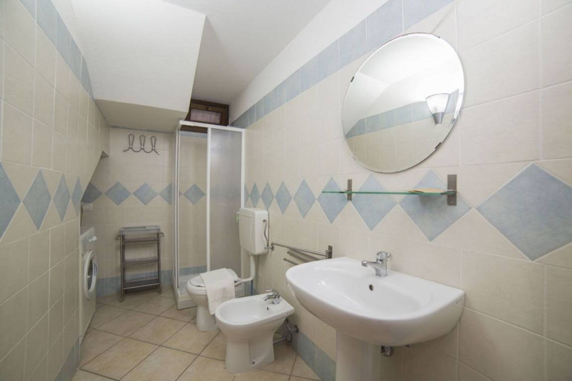 Badezimmer: Waschbecken, WC, Bidet, Dusche, Waschmaschine.