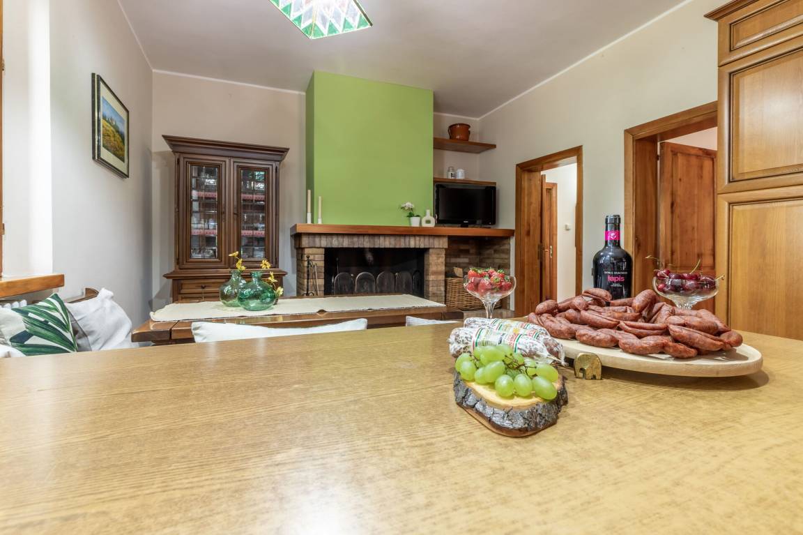 Wohnküche: Esstisch, Kühlschrank, Tiefkühler, Mikrowelle, Ofen, Italienische Kaffeemaschine, Schreibtisch, Kamin, Doppel-Schlafsofa, Klimaanlage, TV.
