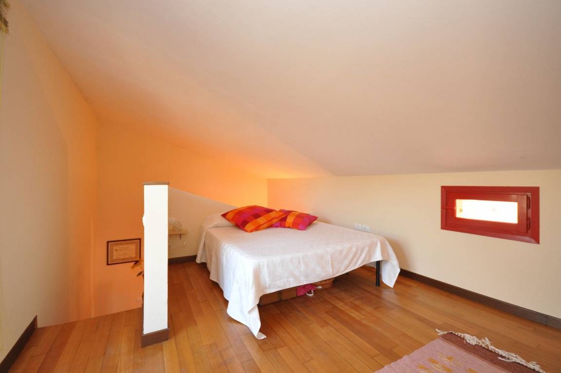 1.Stock (Treppe vom Wohnzimmer aus): Doppelzimmer mit Ehebett (Mindesthöhe 1,20 m), nicht komplett abgetrennt von dem darunterliegenden Wohnzimmer.