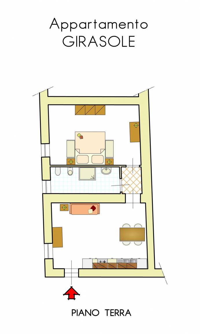 Appartamento Bilocale Piano Terra (50 m²) ist eine eins-Zimmer Wohneinheit, mit eins Badezimmer. Hier können bis zu vier Gäste schlafen.