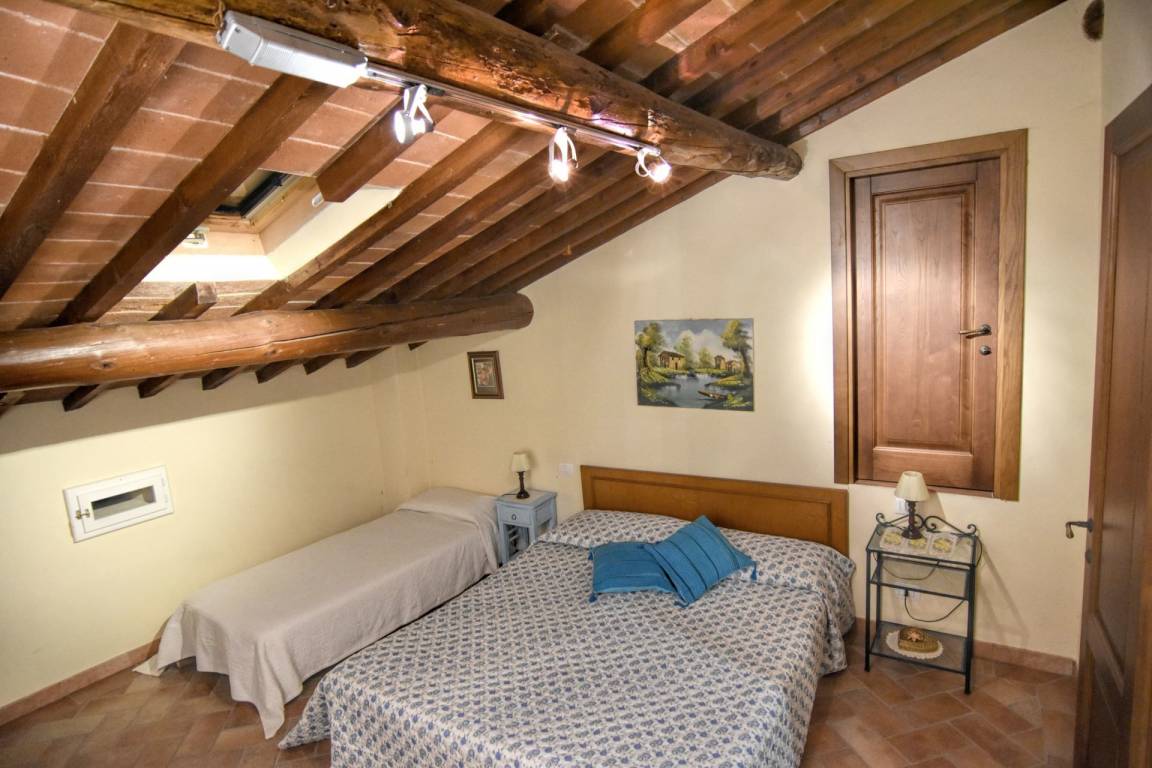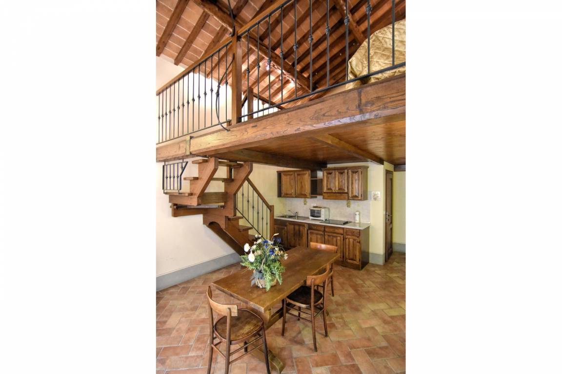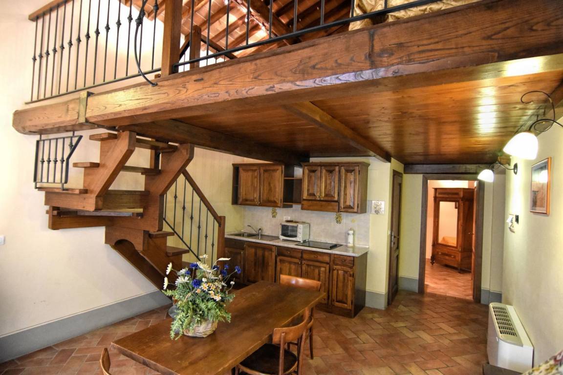 ZWEITER STOCK: mit Zugang über interne Treppe, Wohnzimmer mit Kochnische, Doppelzimmer mit eigenem Bad mit Dusche, Schlafzimmer mit zwei Einzelbetten mit eigenem Bad mit Badewanne. Wohnzimmer mit Kochnische und Doppelzimmer mit eigenem Bad mit Dusche. Vom Wohnzimmer, über eine bequeme Holztreppe, gelangen Sie in das Zwischengeschoss mit Doppelschlafcouch, WC und Doppelzimmer mit eigenem Bad mit Dusche.