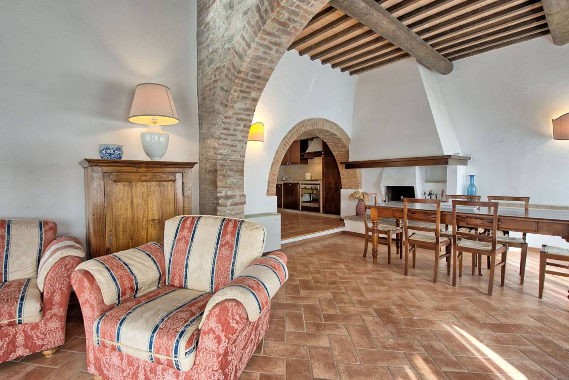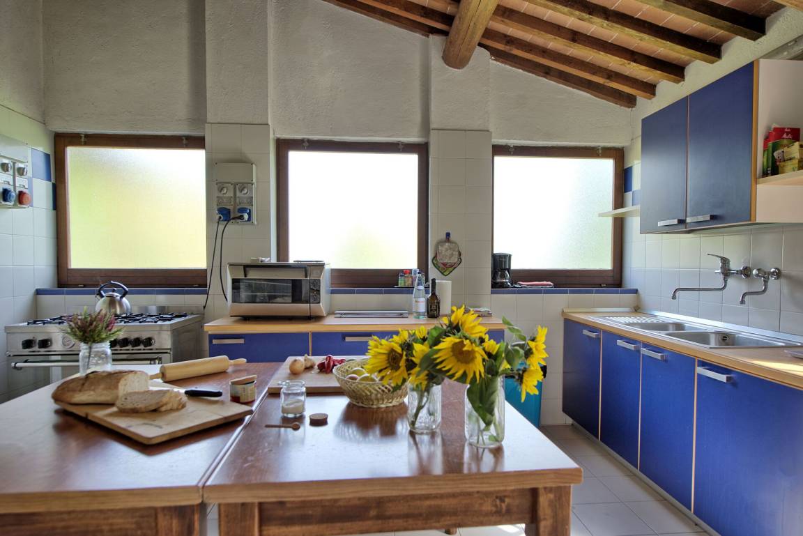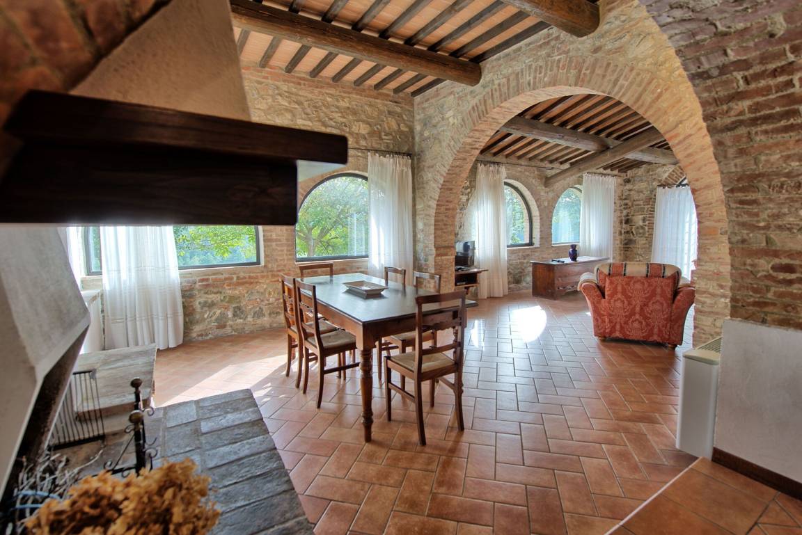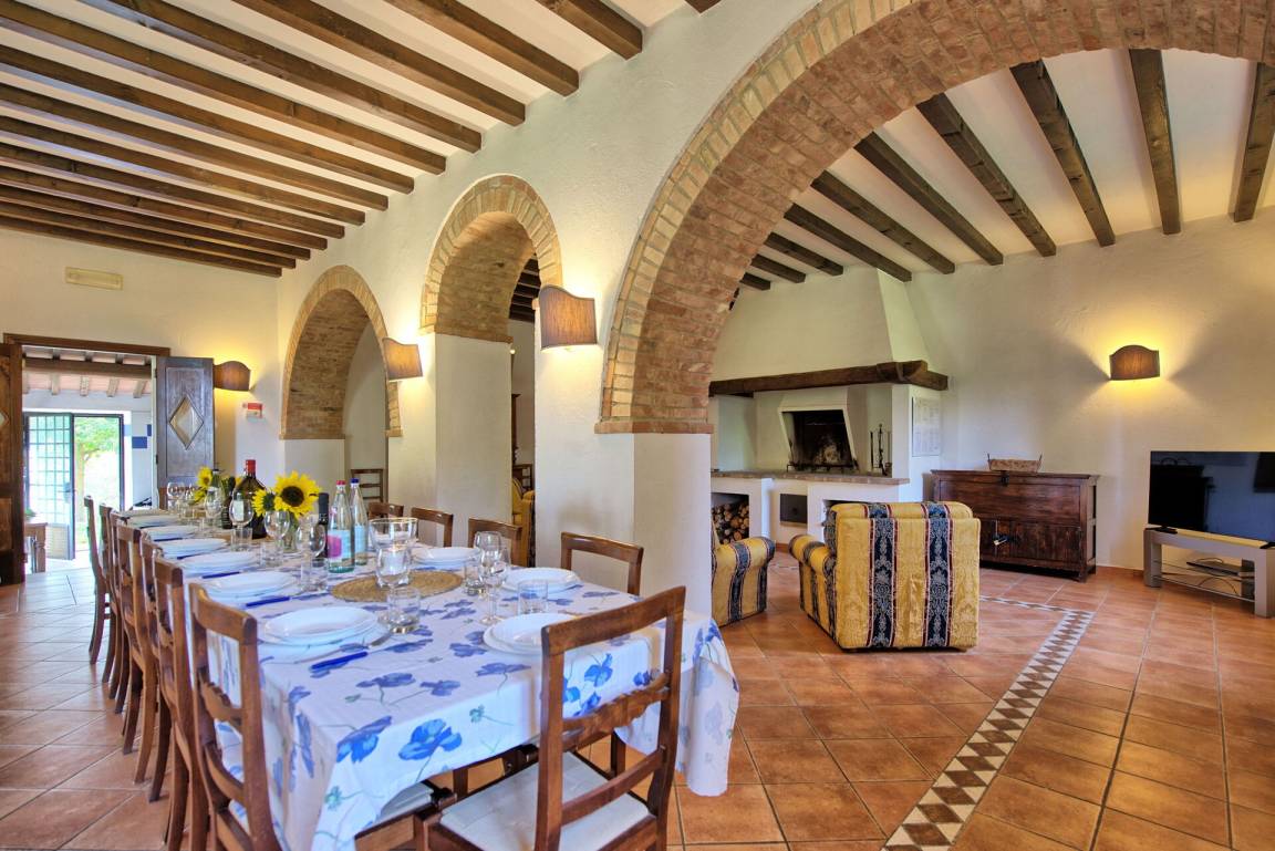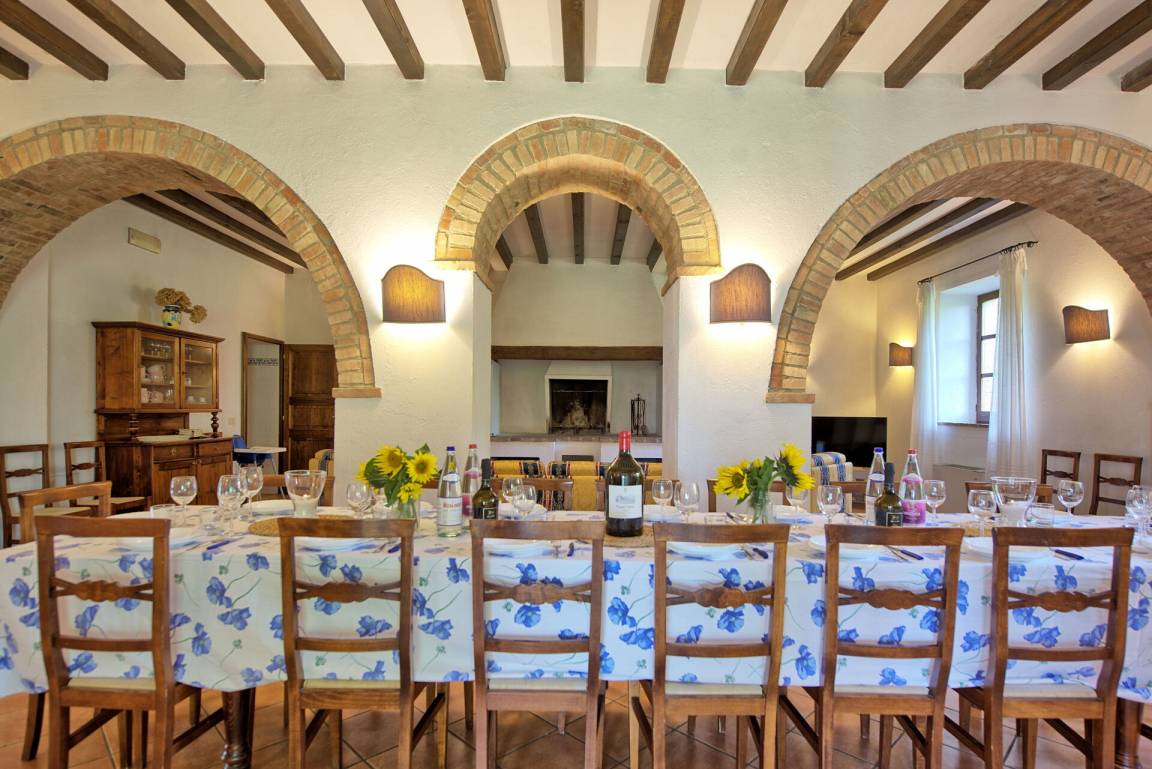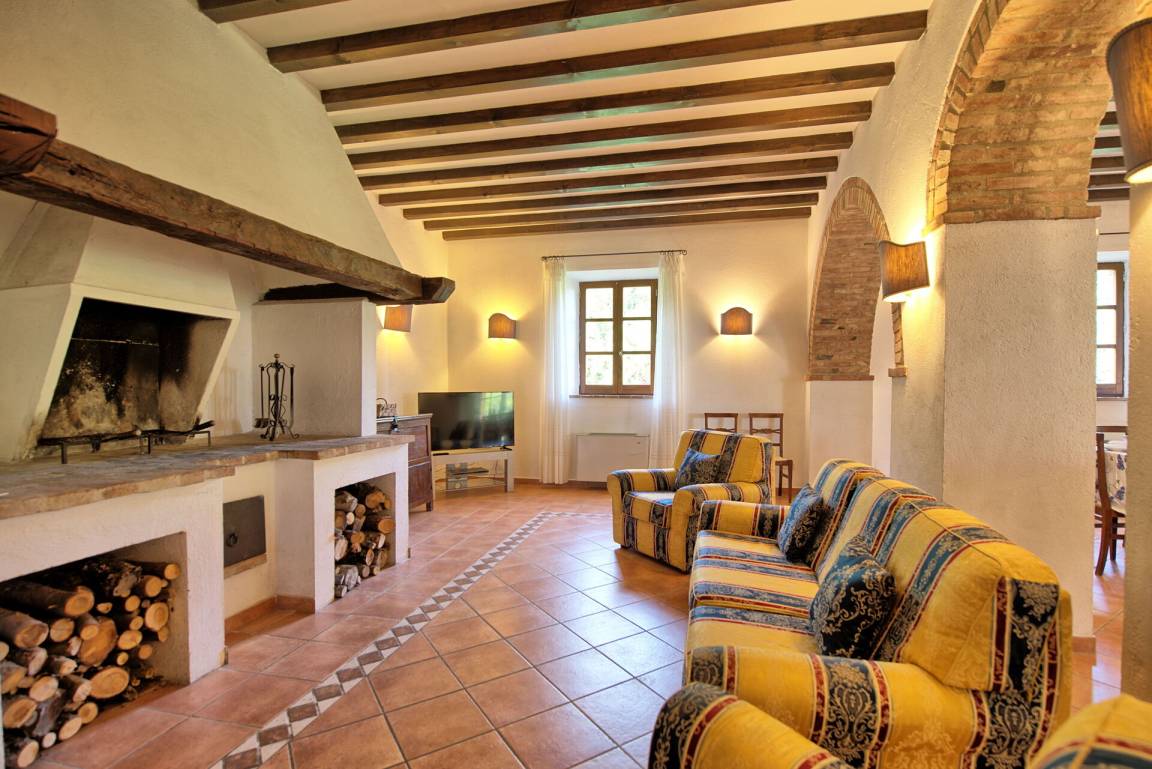 Erdgeschoss (mit separatem Eingang von außen): großer Saal (mit Kamin) von über 80 Quadratmetern, der für Abendessen, Mittagessen und Frühstück genutzt werden kann; vom selben Raum hat man Zugang zu einer halb professionell ausgestatteten Küche; 2 Gäste - WC.