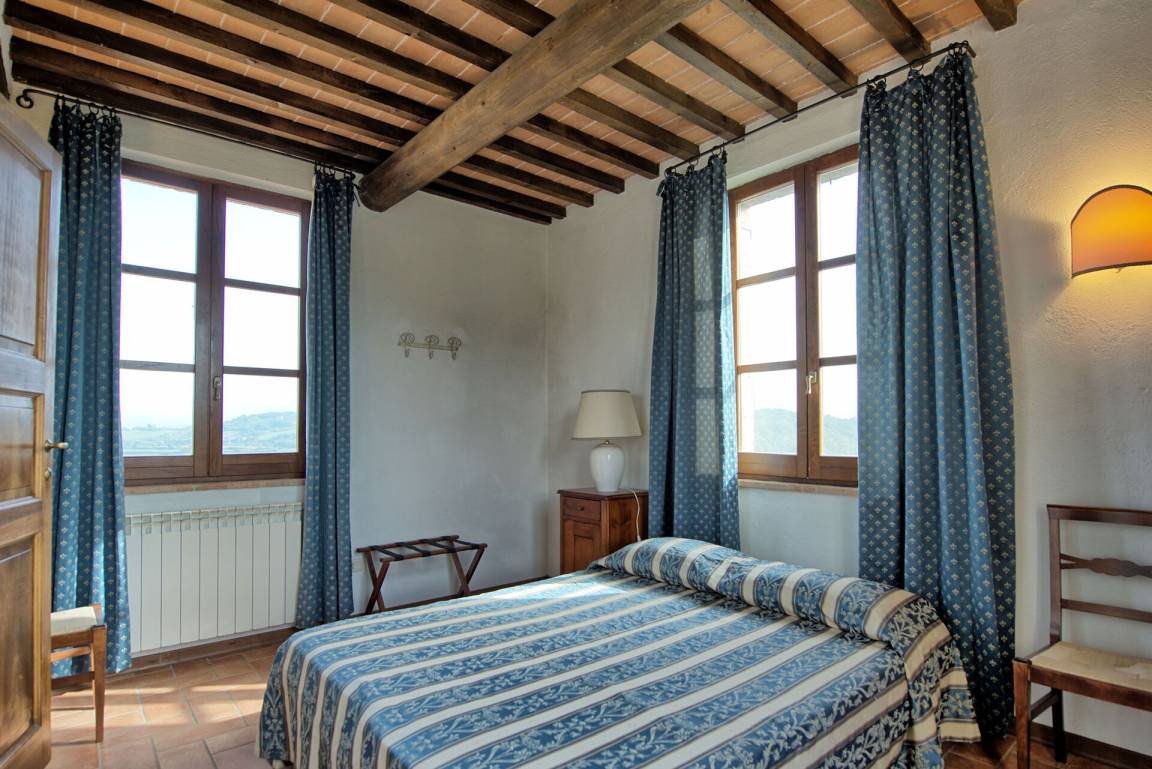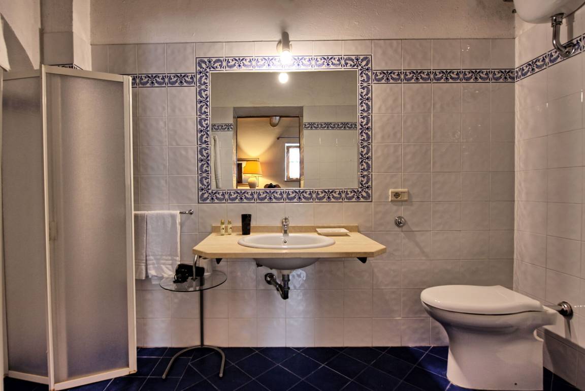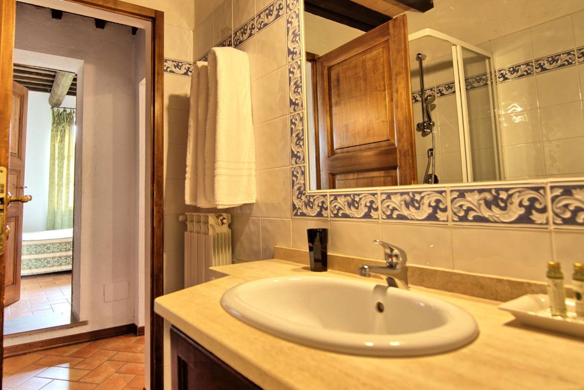 Zweiter Stock (im Panorama-Turm): Doppelzimmer mit Ehebett und privatem Bad mit Dusche.