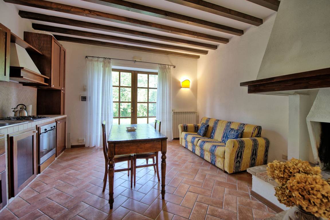 Erster Stock: Wohnzimmer mit Kamin, Essbereich mit Küche, Doppelzimmer mit Ehebett, Bad mit Dusche.