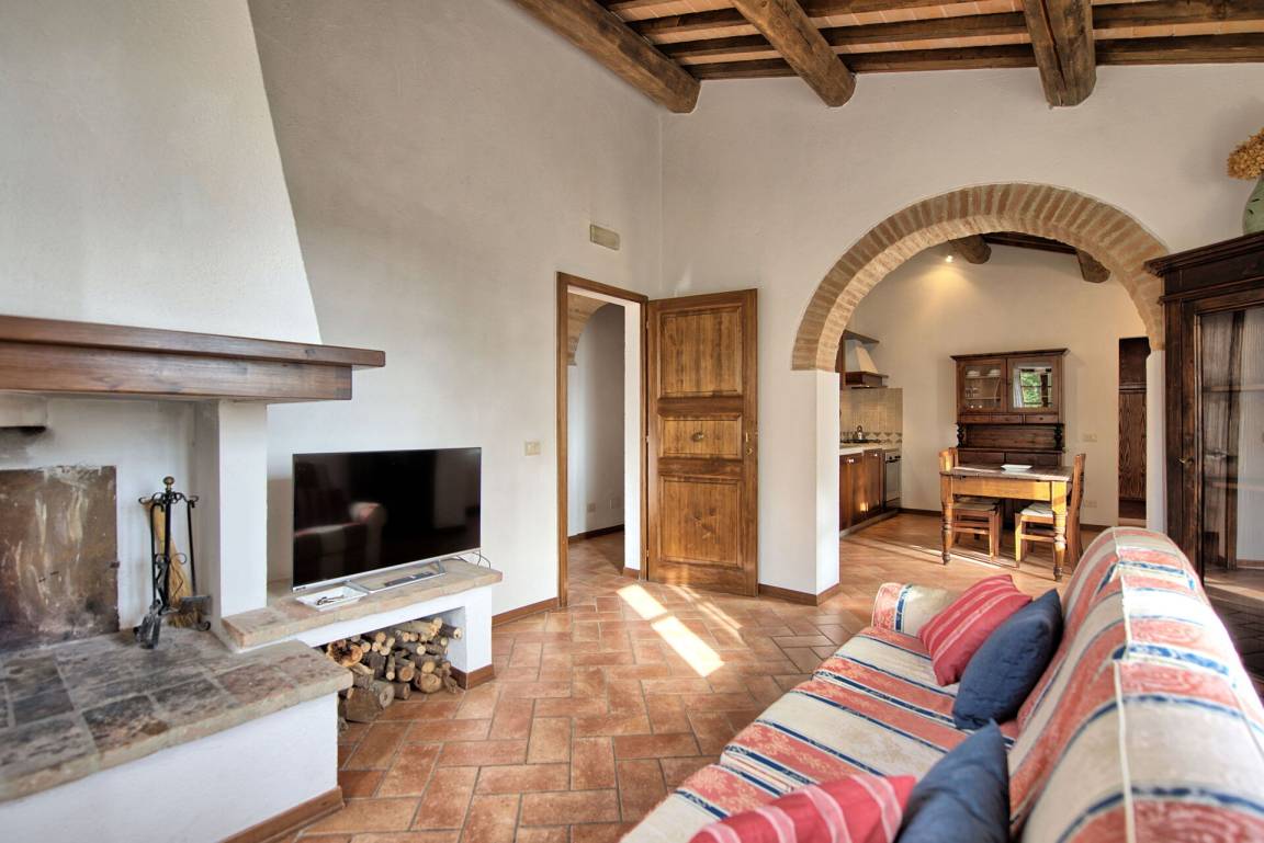 Erster Stock: Wohnzimmer mit Kamin und Kochnische, Doppelzimmer mit Ehebett, Bad mit Dusche.