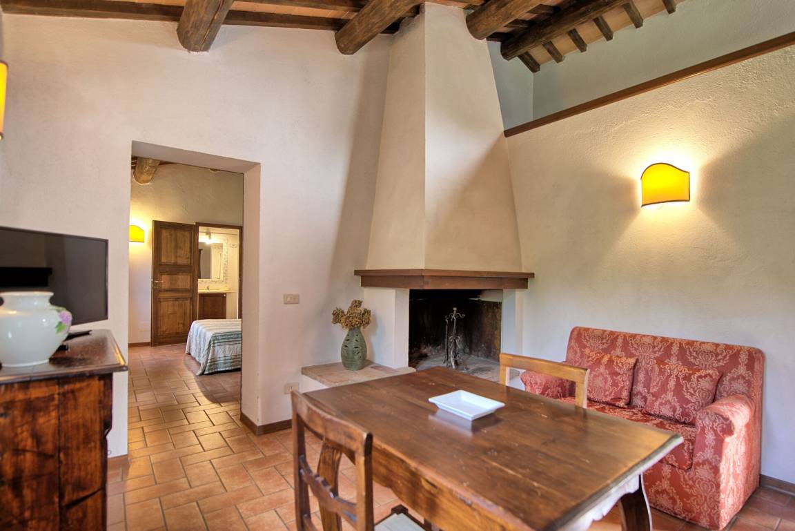 Erster Stock: Wohnzimmer mit Kamin und Kochecke, Doppelzimmer mit Ehebett, Bad mit Dusche.