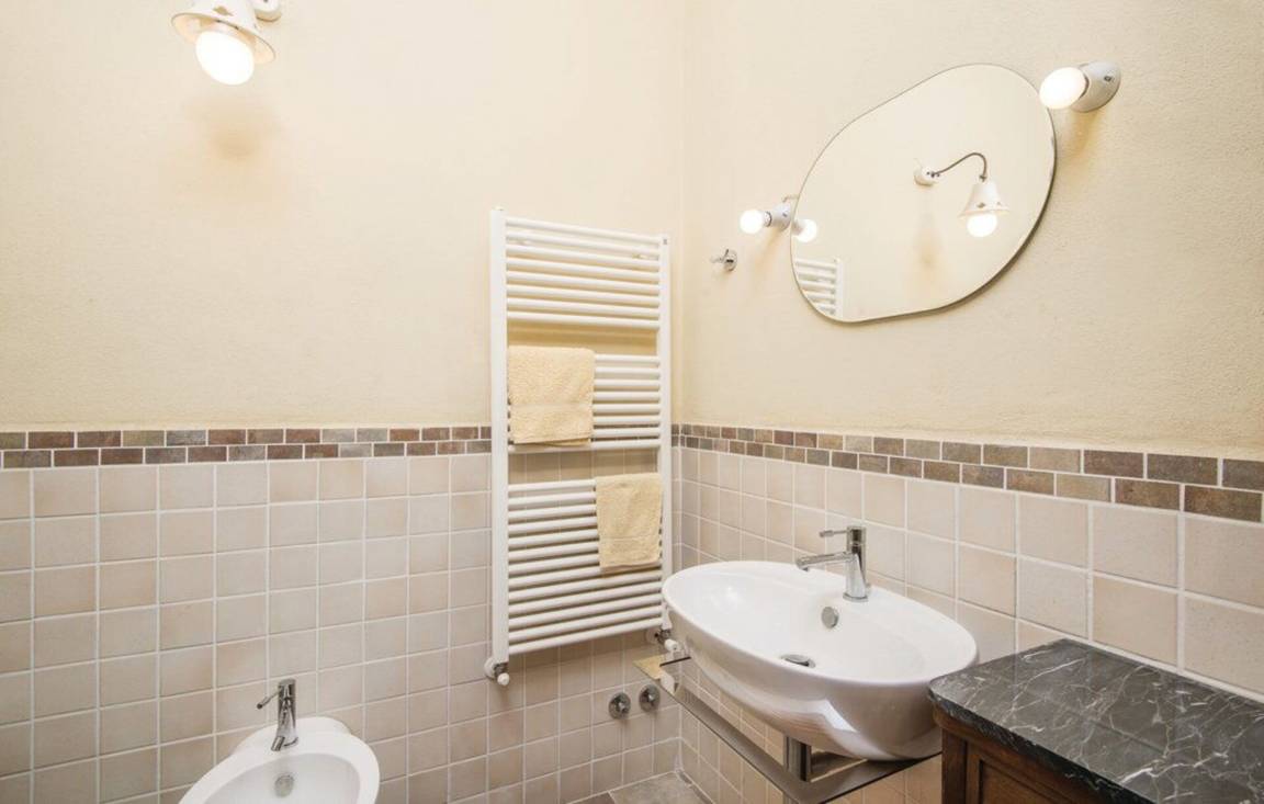 Badezimmer: Waschbecken, WC, Bidet, Dusche, Fön, WiFi Internet.