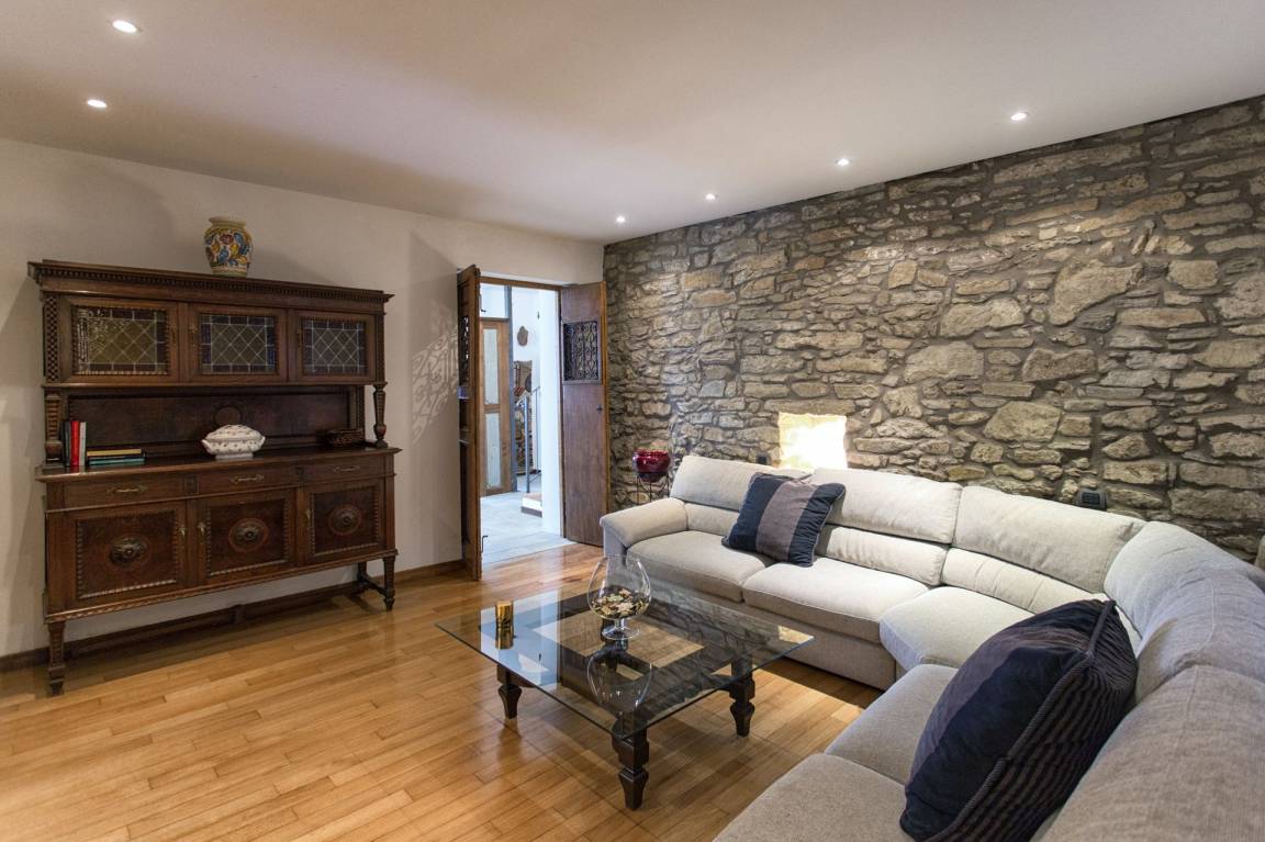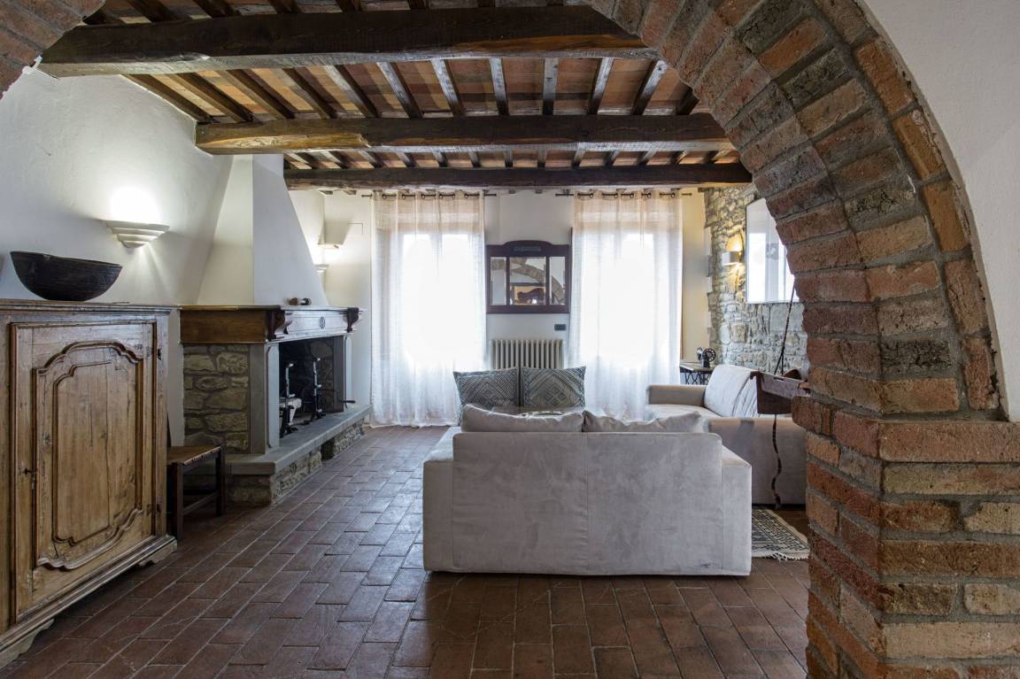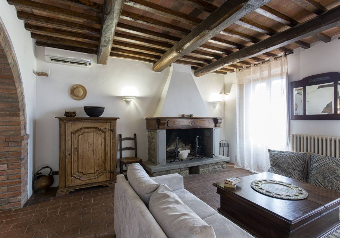 Wohnzimmer: Sofa (Personen: 4), Kamin, Doppel-Schlafsofa, Klimaanlage, Ausgang auf die Terrasse.