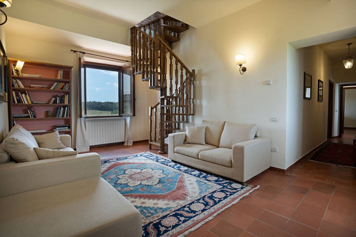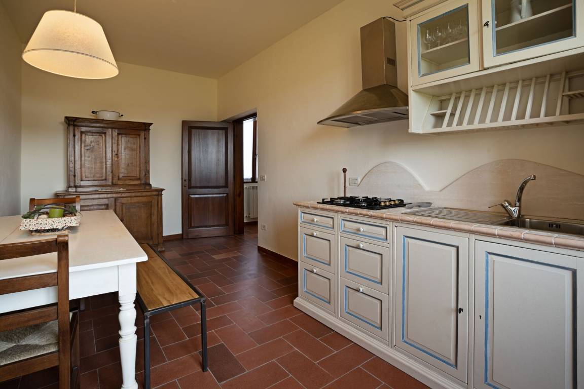 Zweiter Stock: Küche (4 Kochstellen, Kühlschrank, Espressomaschine, Wasserkocher) mit Esstisch, Doppelzimmer mit Ehebett und privatem Bad mit Dusche, Wohnzimmer, Doppelzimmer mit Ehebett, Bad mit Dusche.
