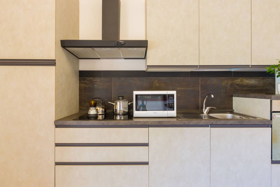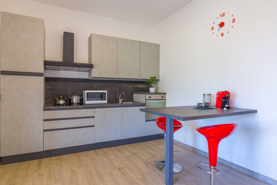Küche: gut ausgestattete Küche, Esstisch, Spülmaschine, Kühlschrank, Tiefkühler, Mikrowelle, Herd, Italienische Kaffeemaschine, Ausgang auf den Garten, Ausgang auf die Terrasse.