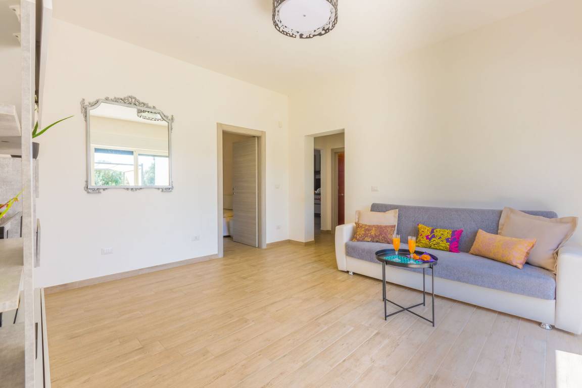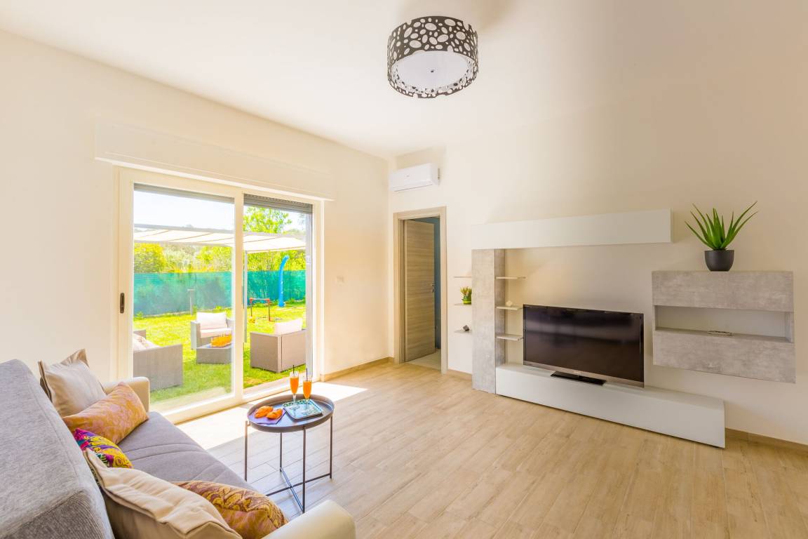 Wohnzimmer: Sofa bed, Klimaanlage, TV, Ausgang auf den Garten.