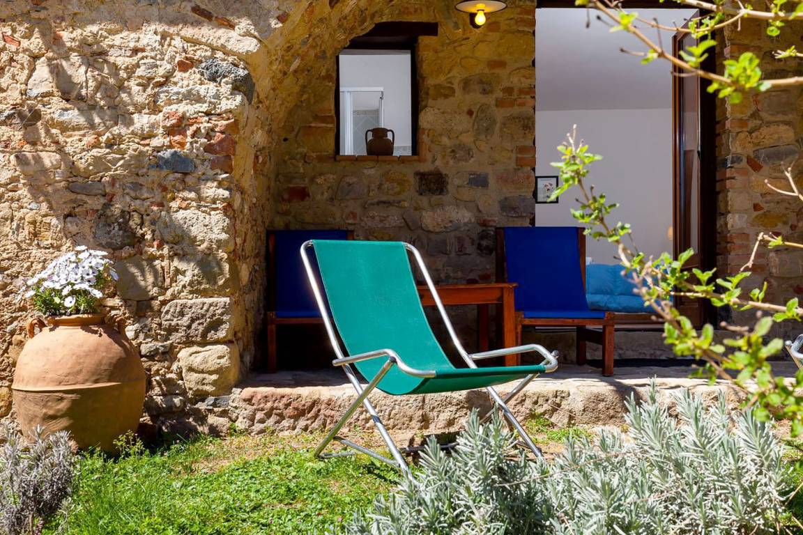 Dank der teilweise in Bruchstein gestalteten Fassadenarchitektur bewahrt sich das Bauernhaus seinen rustikalen Charakter. Im Inneren ist es den Eigentümern Pantaleo und Alberta gelungen, ein stilvolles und zugleich behagliches Ambiente mit dem für die Region typischen Arte Povera-Mobiliar zu schaffen.