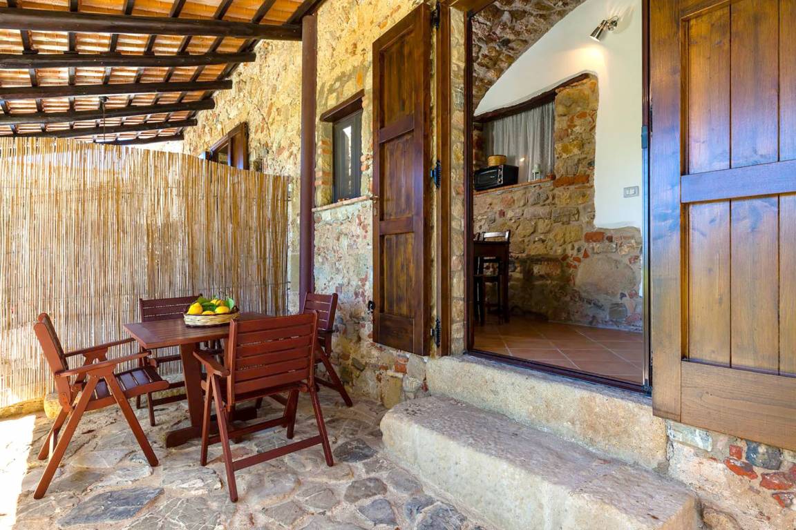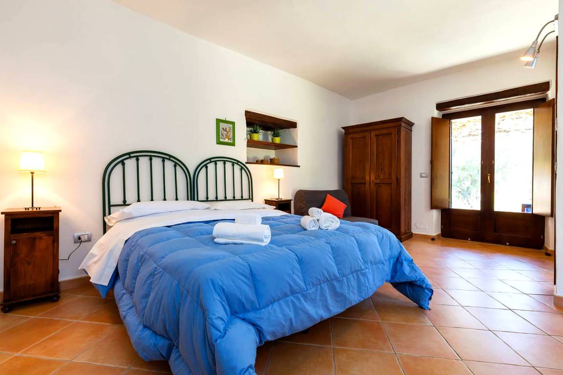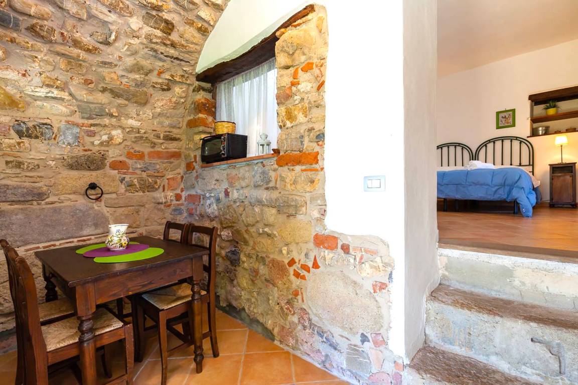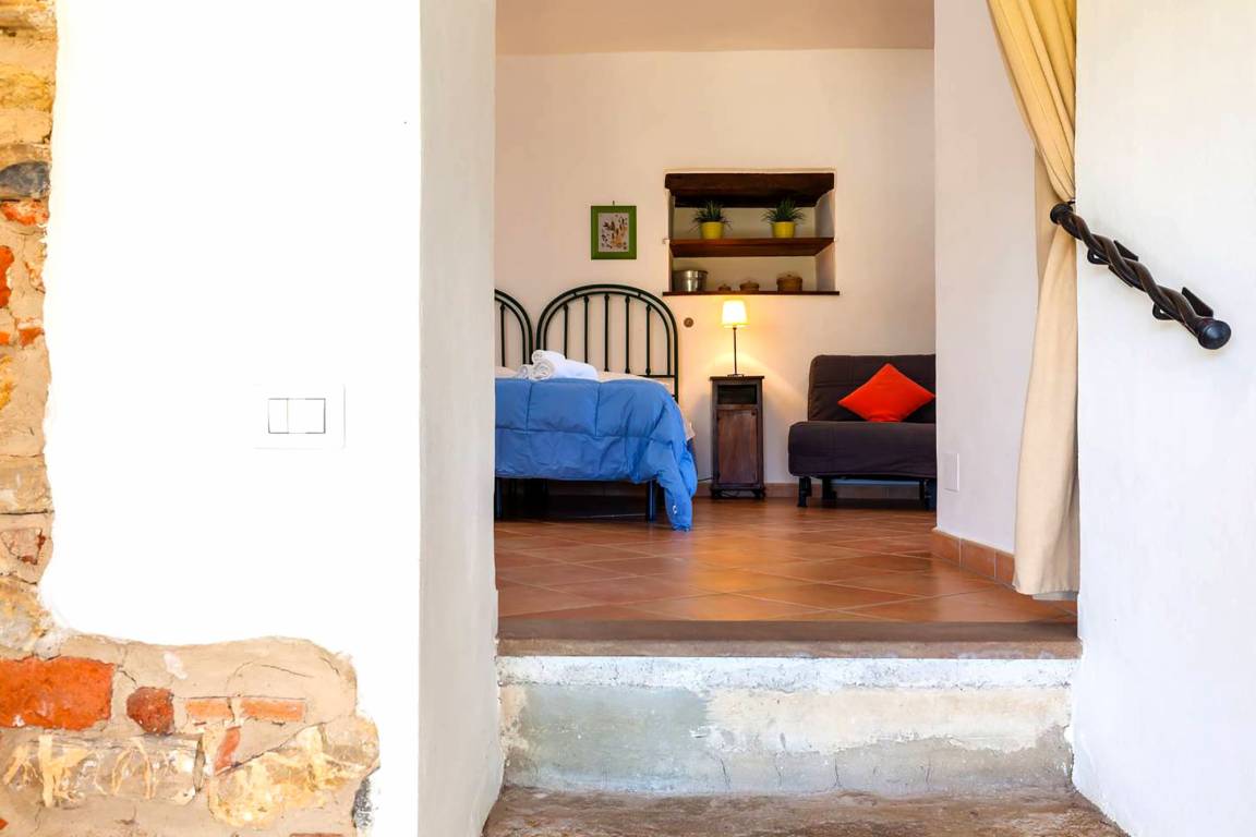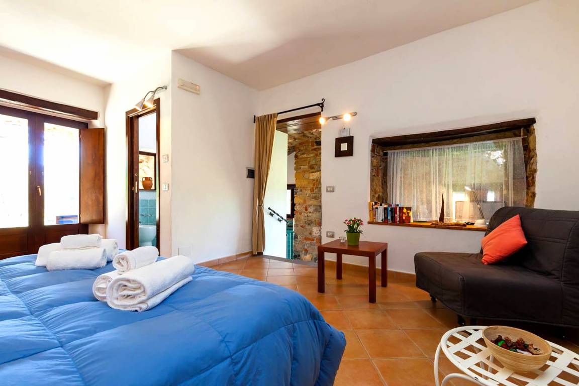 A few steps up from the kitchen, a remarkable round arch shaped opening lets you into a large room which is both living and sleeping area (double bed, pull-out sleeper chair) with enough space for relaxing and feeling at ease and access of the bathroom (shower/WC/bidet) as well as the outdoor area.