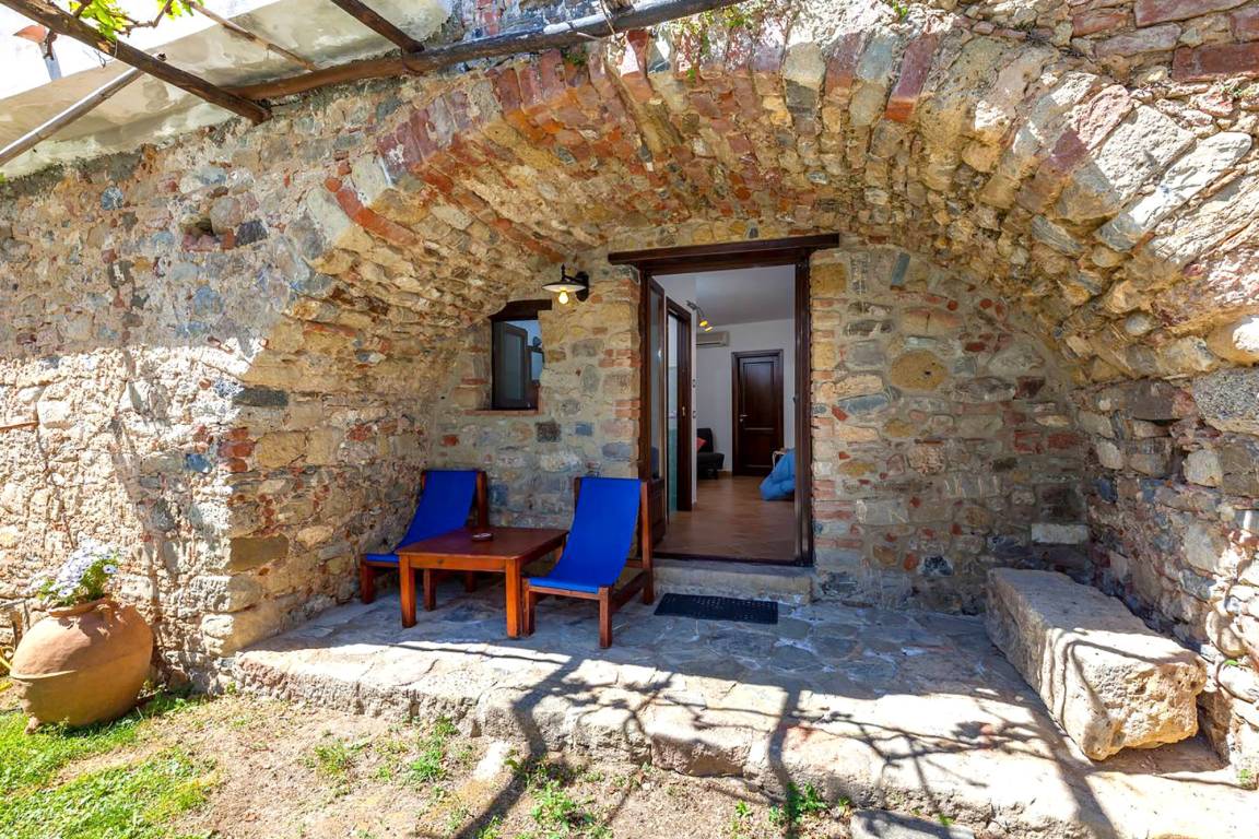 When vacationing in the south, you wish to spend as much time as possible outdoors. At Il Mosaico, you can do so on two terraces: The one in front of the entrance faces the Tyrrhenian Sea; the one accessible from the bedroom faces the soothing green of the olive trees. Of course you can also take it easy in the well-tended garden, which is shared by all the guests of Le Terme di Velia and from where your gaze roams as far as the excavation site of the ancient Greek town of Elea (later Velia, then Ascea).